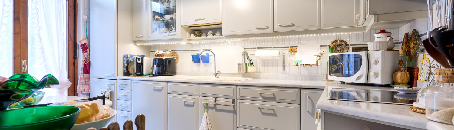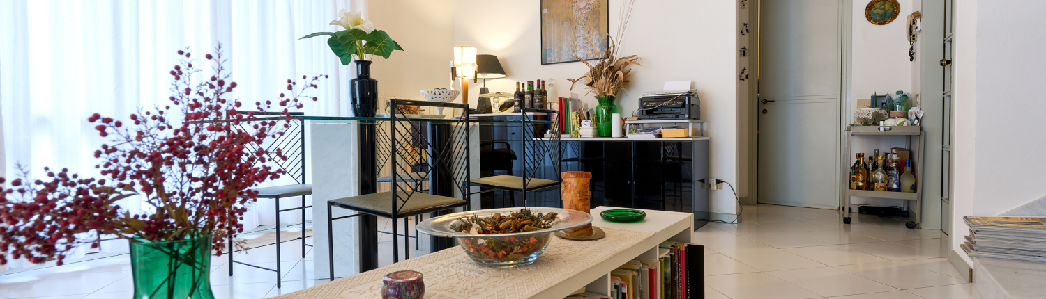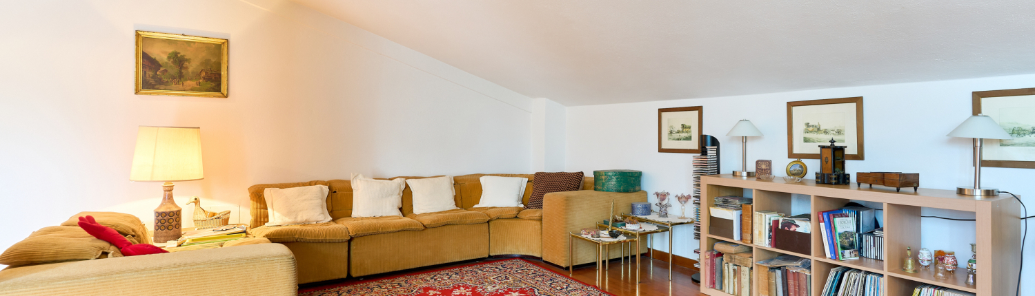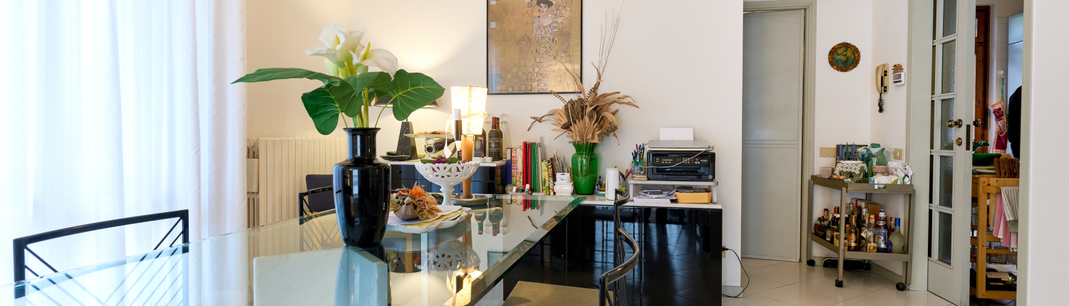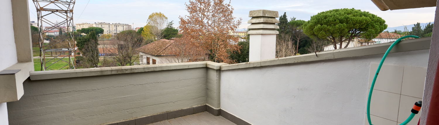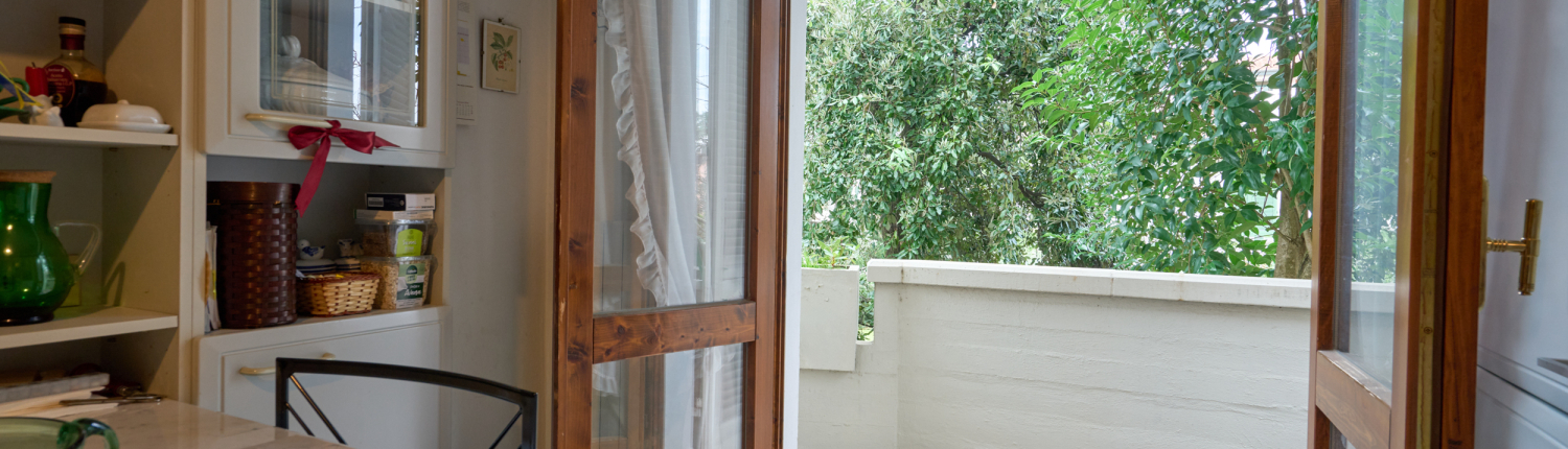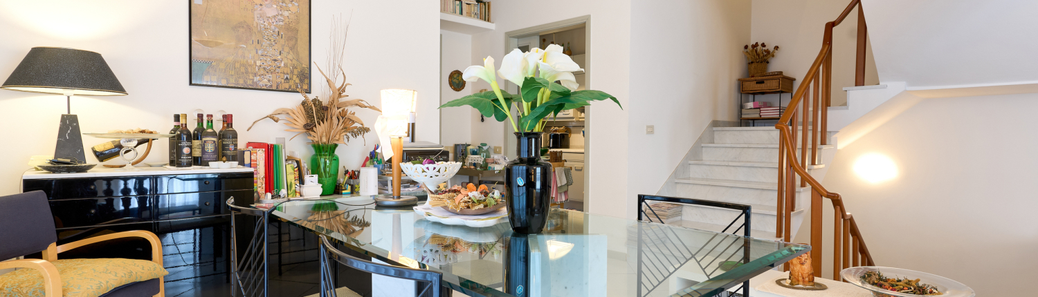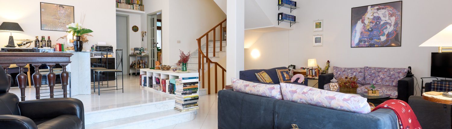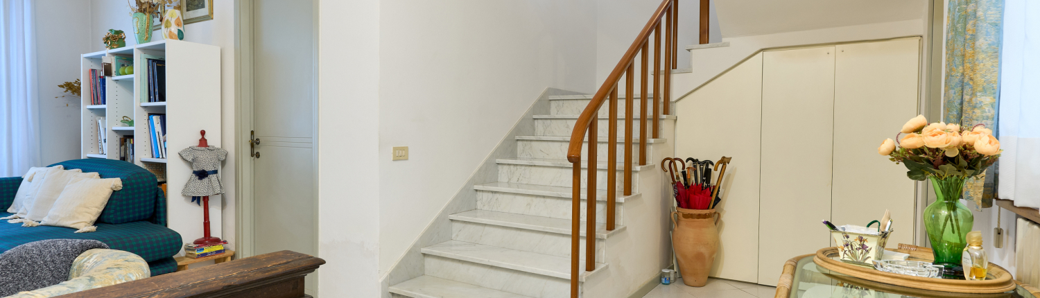 Una scala in marmo di Carrara conduce al luminoso soggiorno open space articolato su due livelli, con accesso al balcone. La cucina abitabile, anch’essa con balcone dedicato, è affiancata da un bagno di servizio e da un ulteriore ripostiglio.