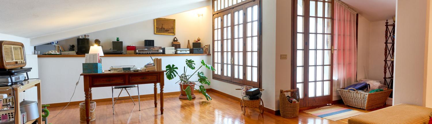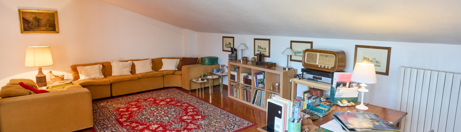 Una raffinata scala in legno porta alla mansarda, attualmente adibita a studio, con accesso esclusivo alla terrazza a tetto, ideale come spazio relax.