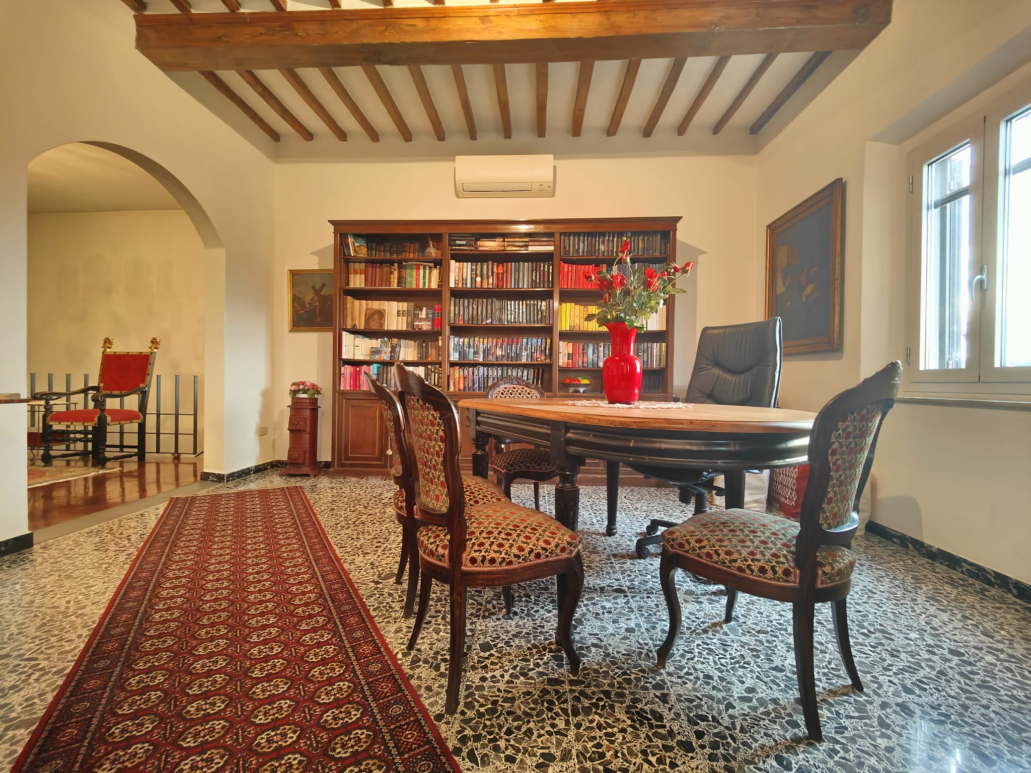 Una splendida scala, elemento architettonico di grande eleganza, conduce al primo piano dove si trovano un grande salone, uno studio e un ripostiglio, ideali come zona living o area lavoro.