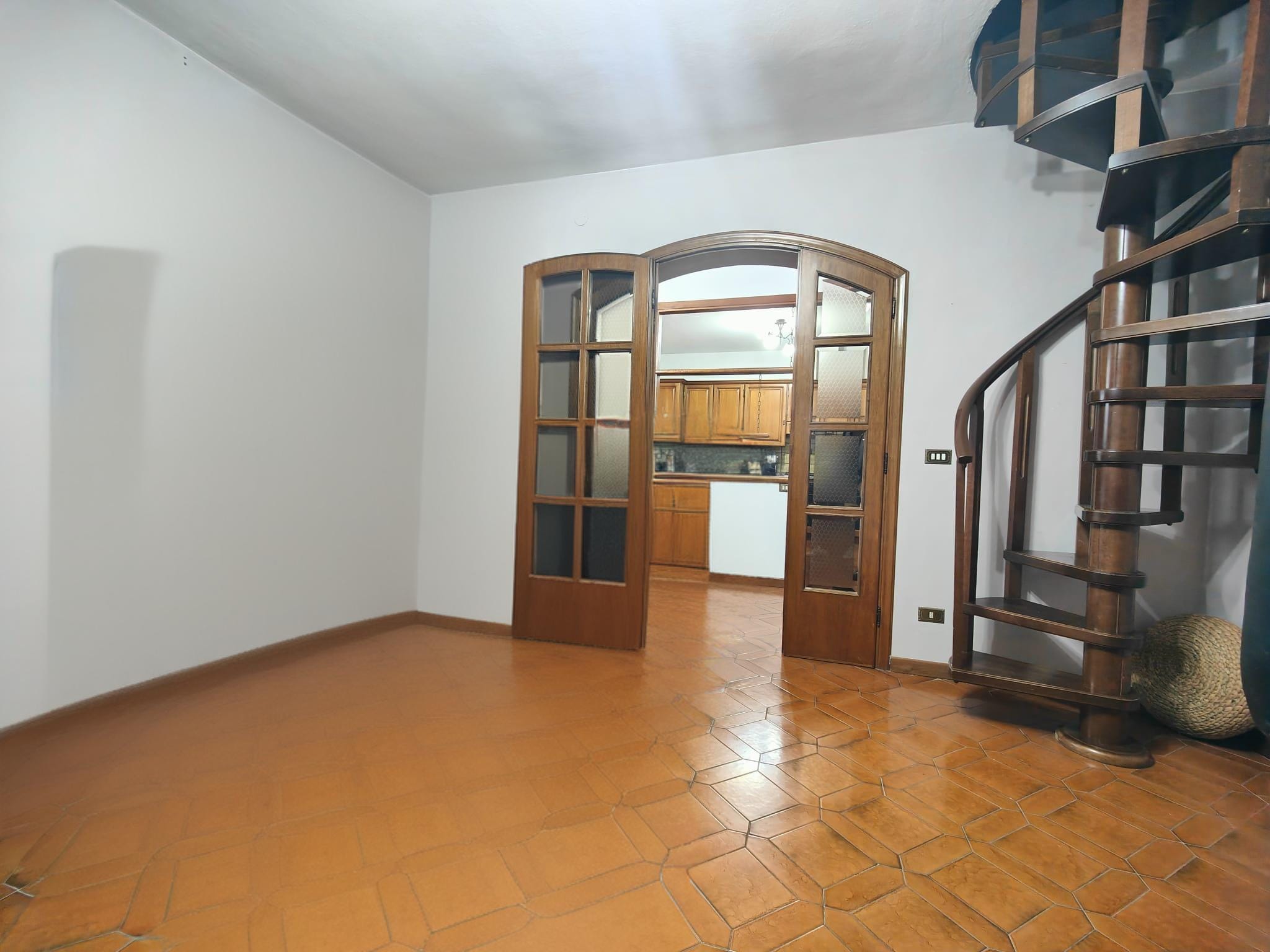 Dal soggiorno, tramite scala a chiocciola in legno, si accede a un sottotetto ampio e versatile, attualmente da rifinire, ideale come rimessa, zona relax o spazio multifunzionale.