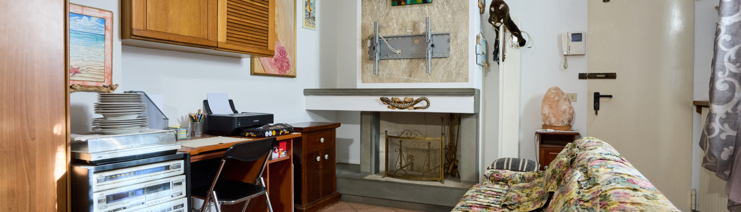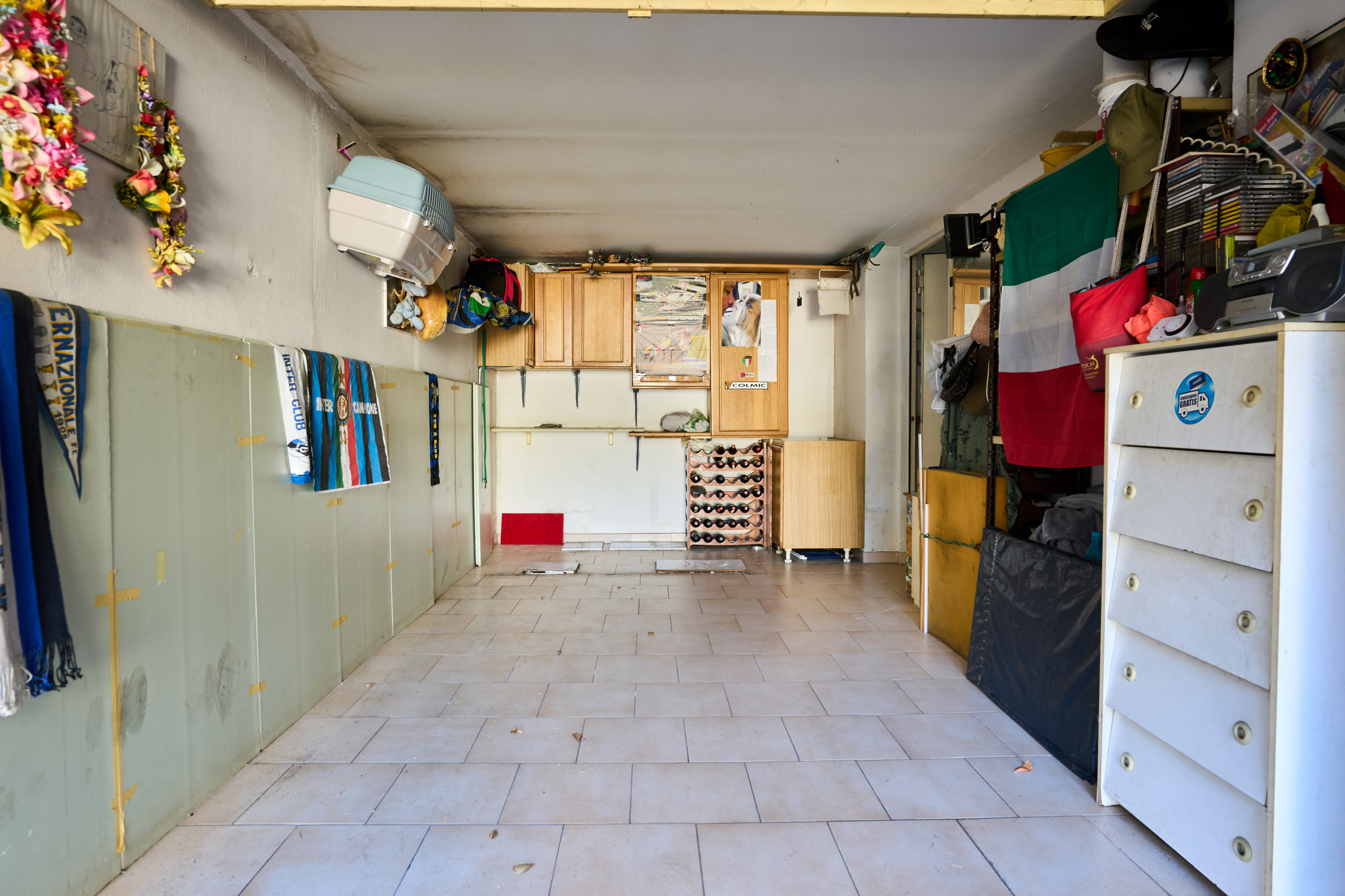 Dal soggiorno si accede alla taverna con camino, ambiente caldo e conviviale, dove si trovano anche un comodo ripostiglio e il collegamento diretto al garage (con accesso carrabile anche dall’esterno tramite cancello condominiale).
