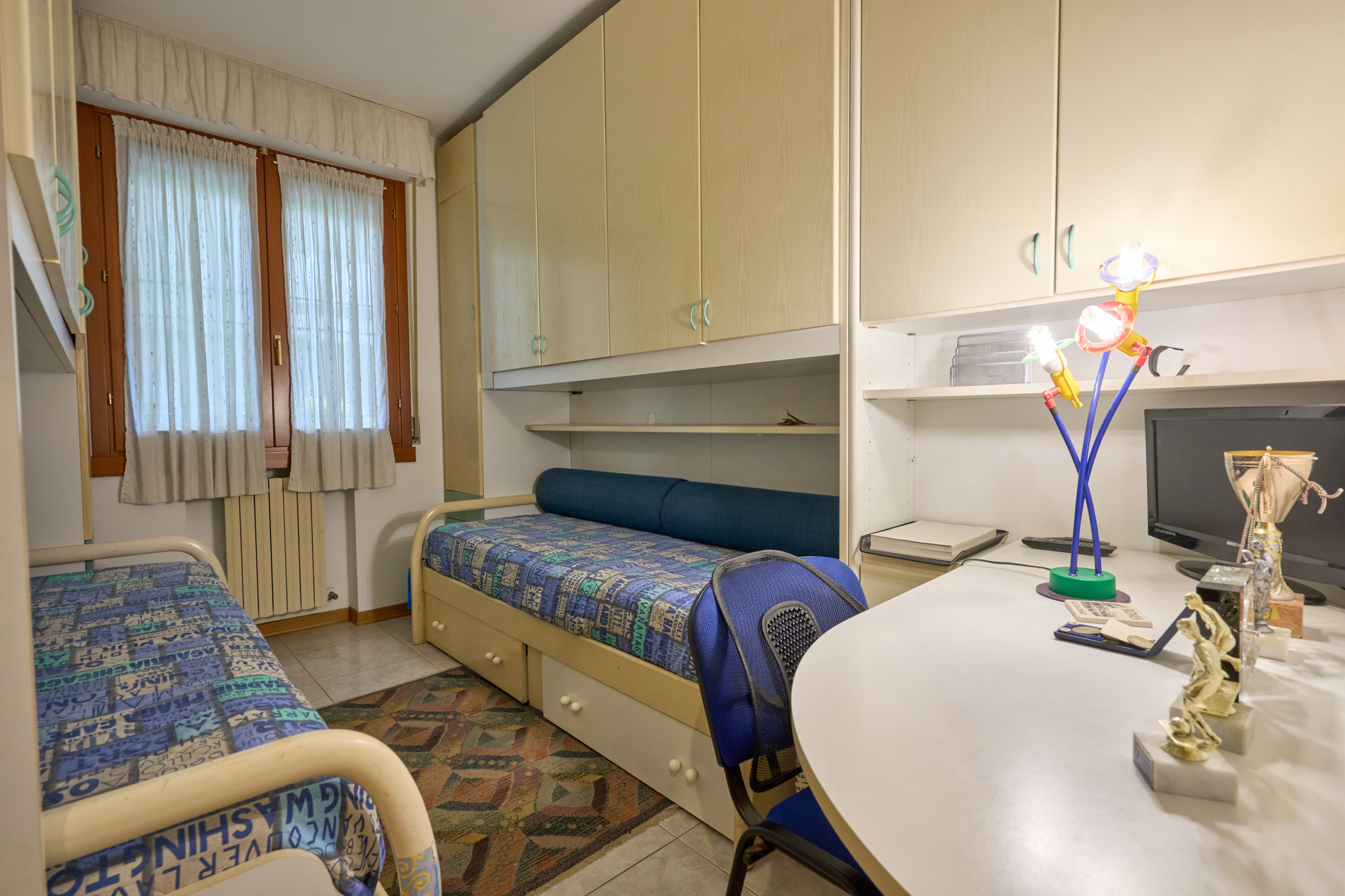La zona notte comprende una camera matrimoniale, una cameretta e due bagni: uno finestrato con vasca, l’altro con doccia.