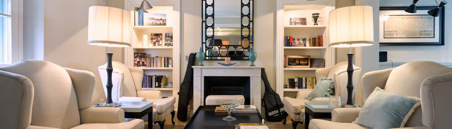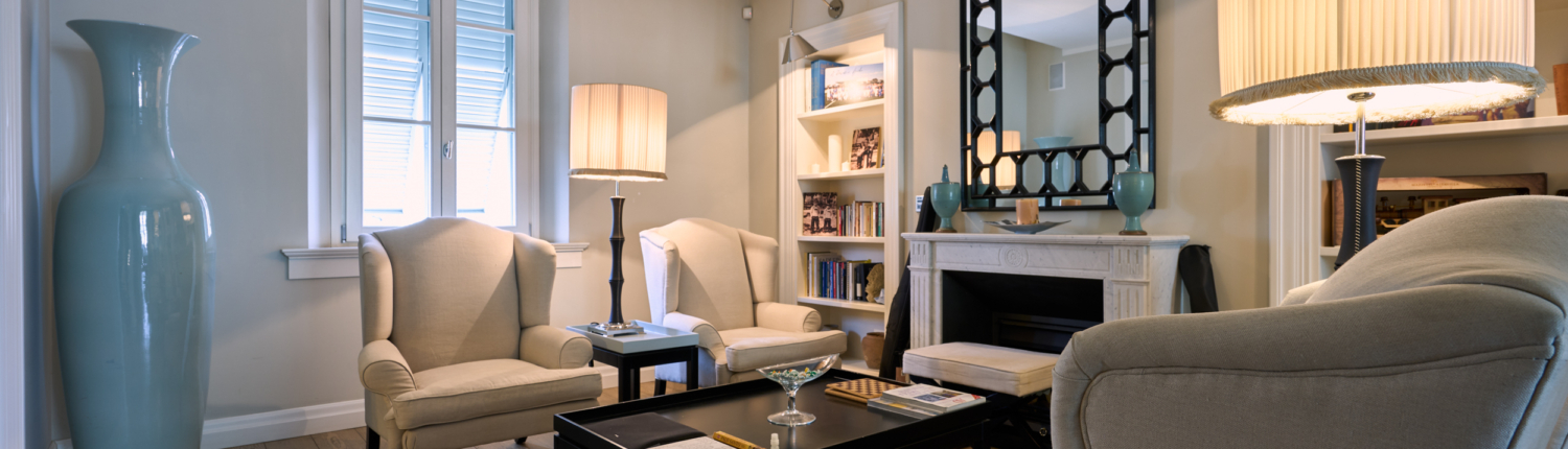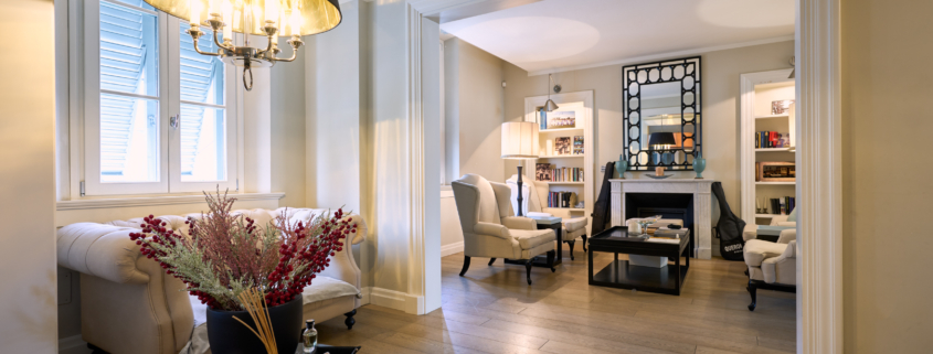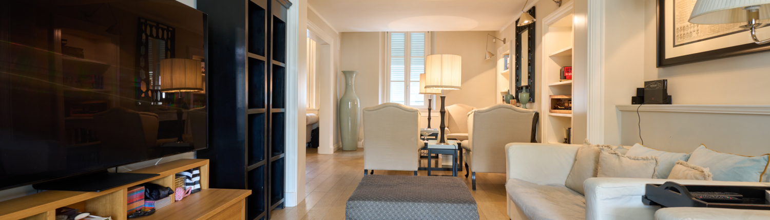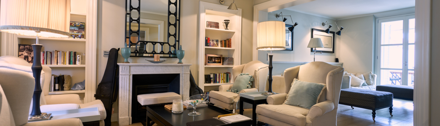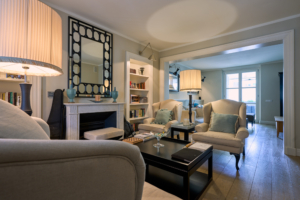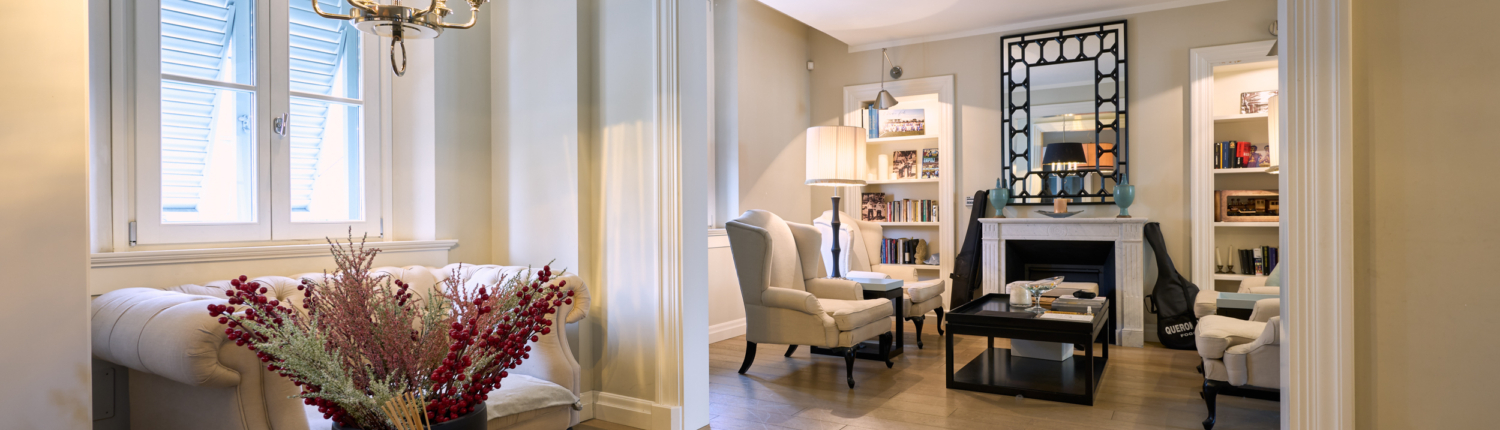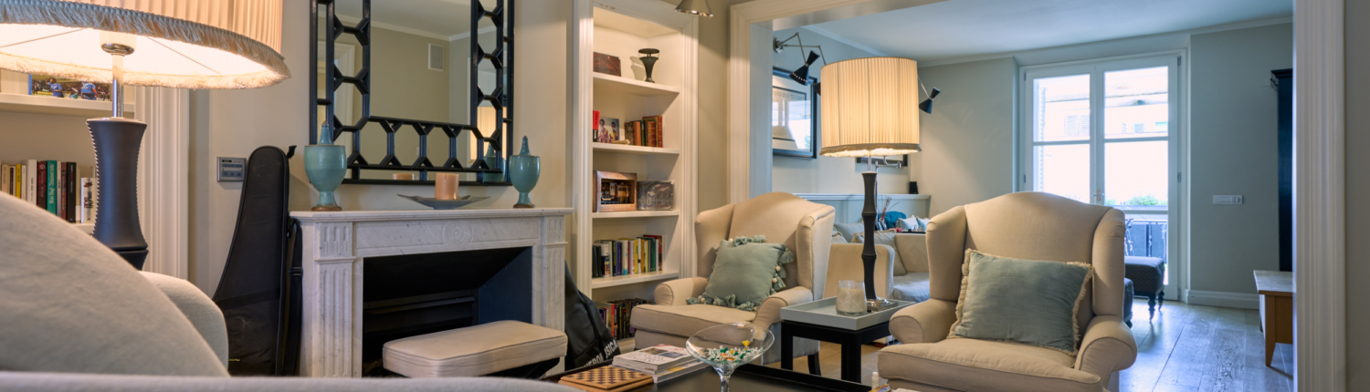 Il salotto, elegante e accogliente, è impreziosito dal camino che ne diventa elemento centrale, creando un’atmosfera calda e raffinata. Gli ambienti sono luminosi e ben proporzionati, valorizzati dal parquet e dalle ampie aperture.