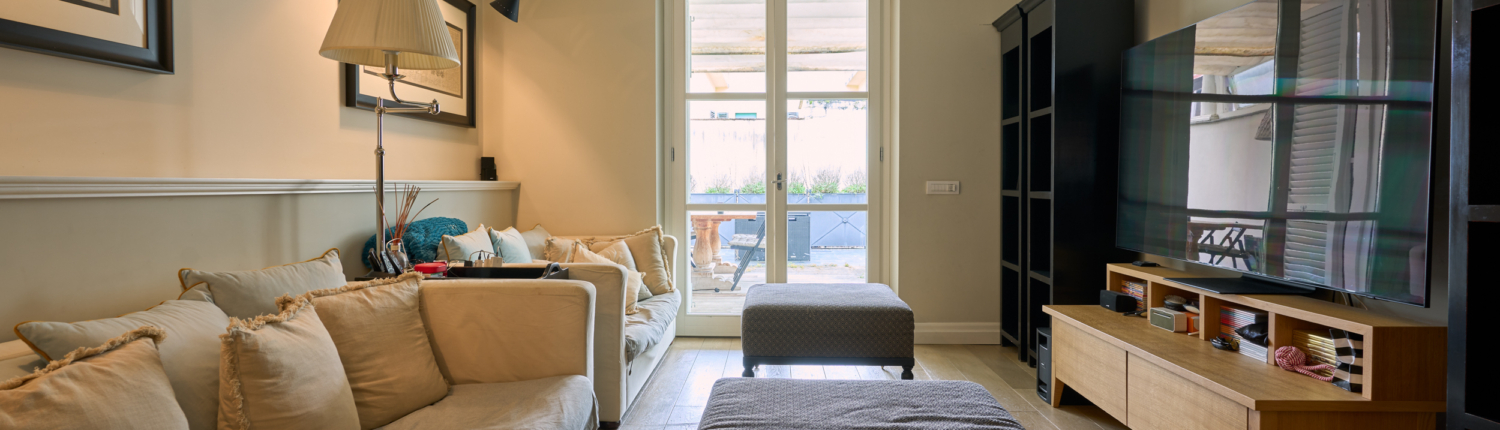 Il soggiorno, in continuità con la sala da pranzo, si apre direttamente sulla splendida terrazza abitabile attraverso grandi vetrate, offrendo una perfetta fusione tra interno ed esterno.