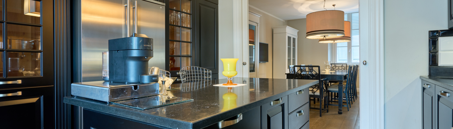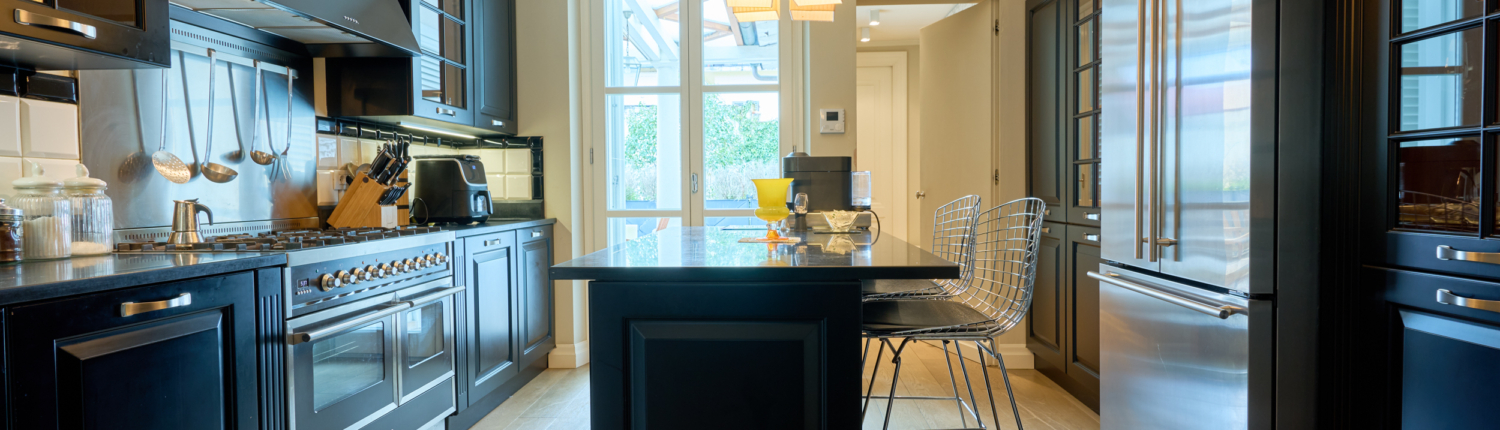 Grande sala da pranzo con cucina a vista, separabile all’occorrenza tramite un’elegante e scenografica porta scorrevole