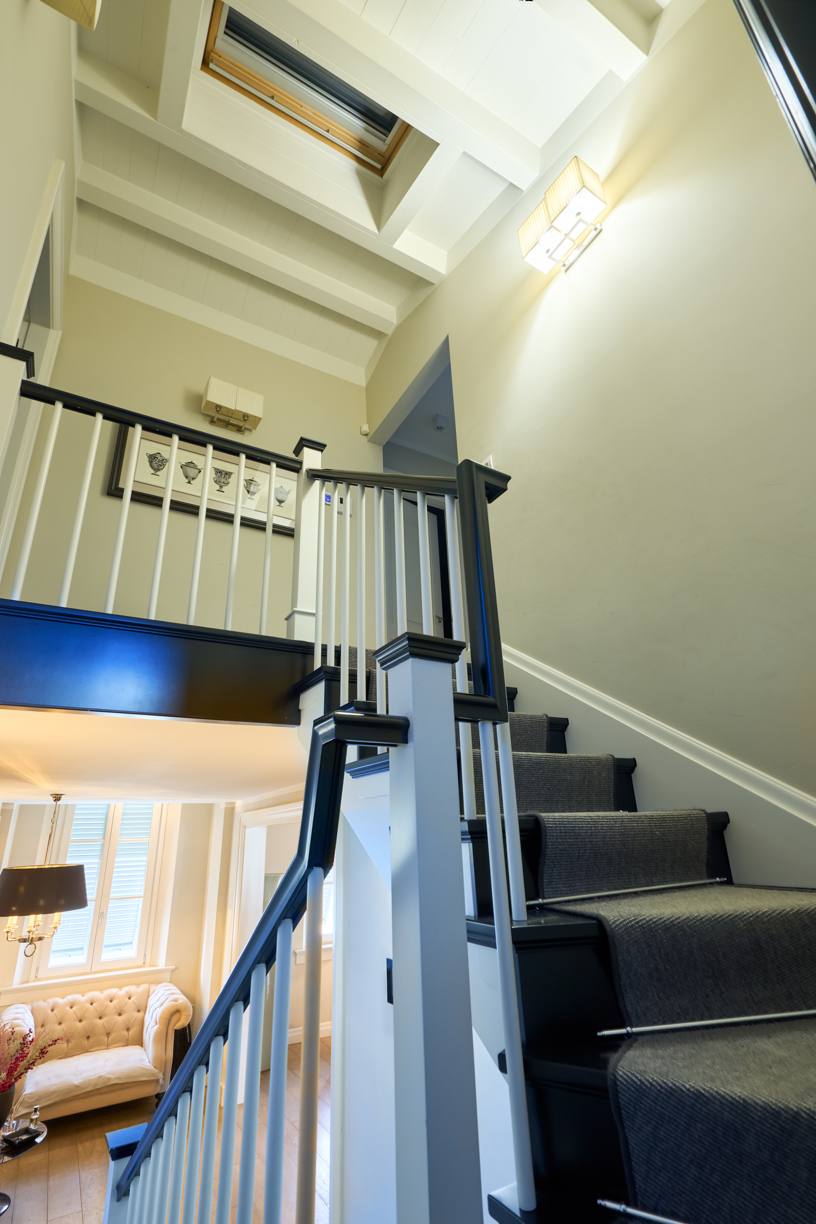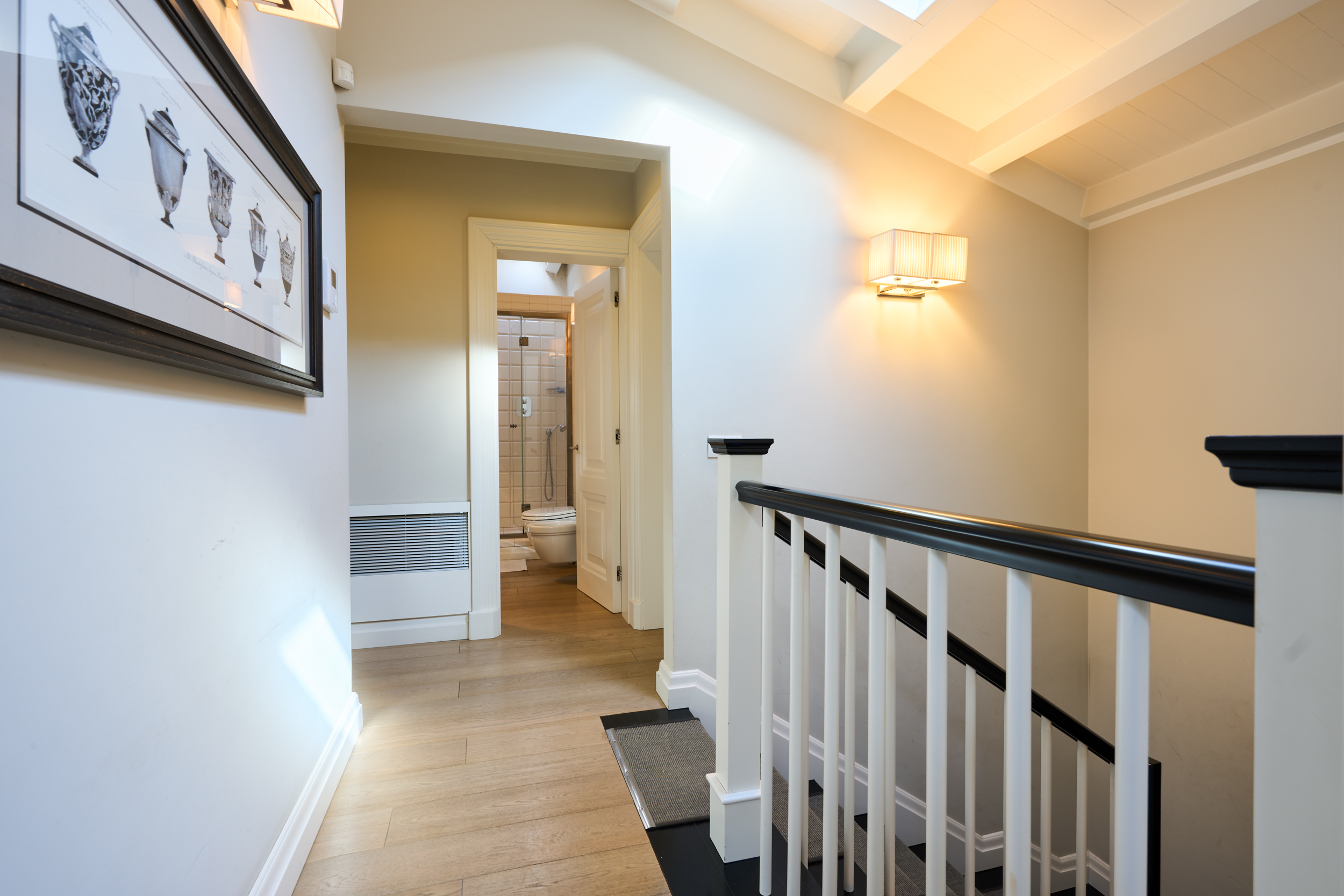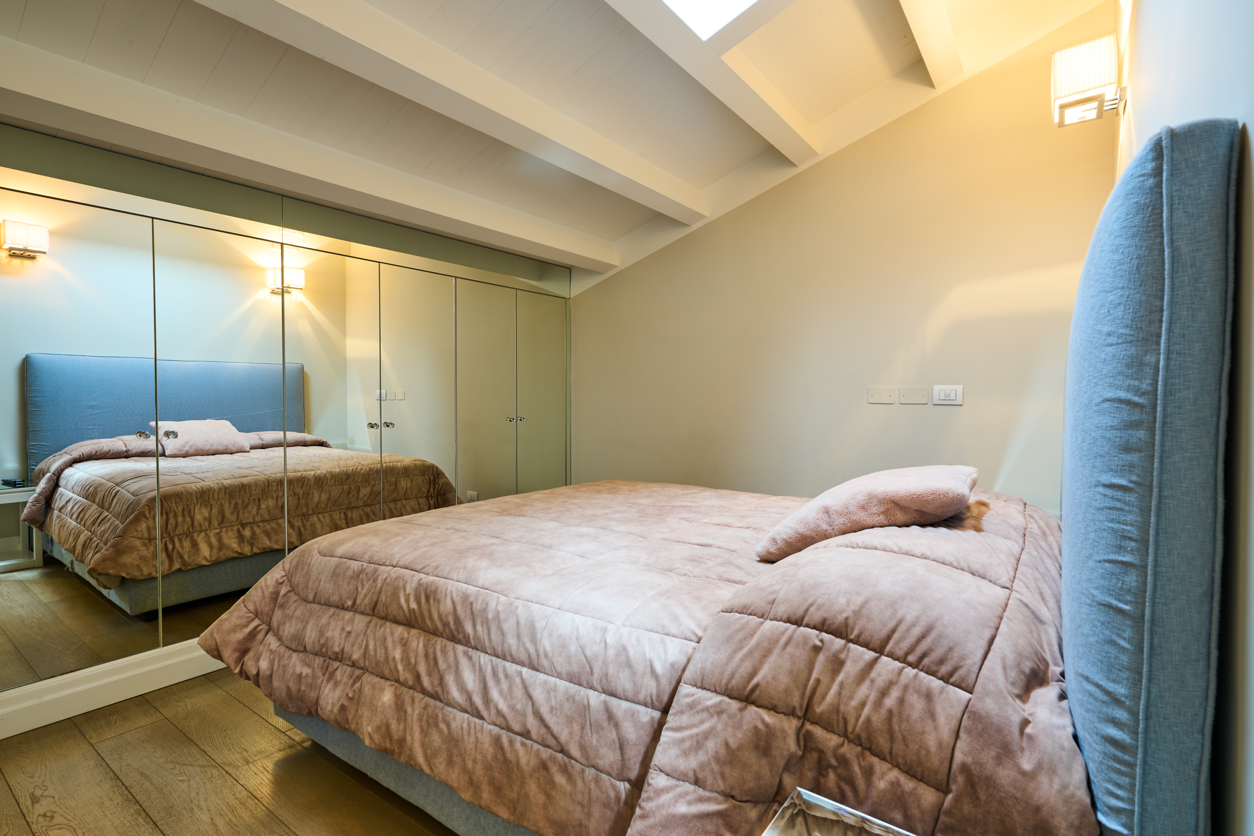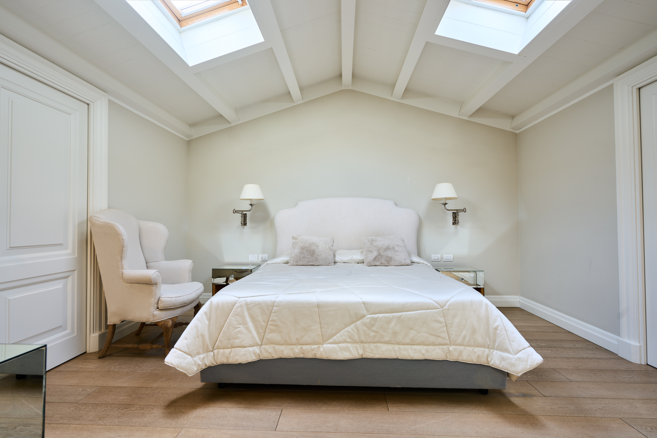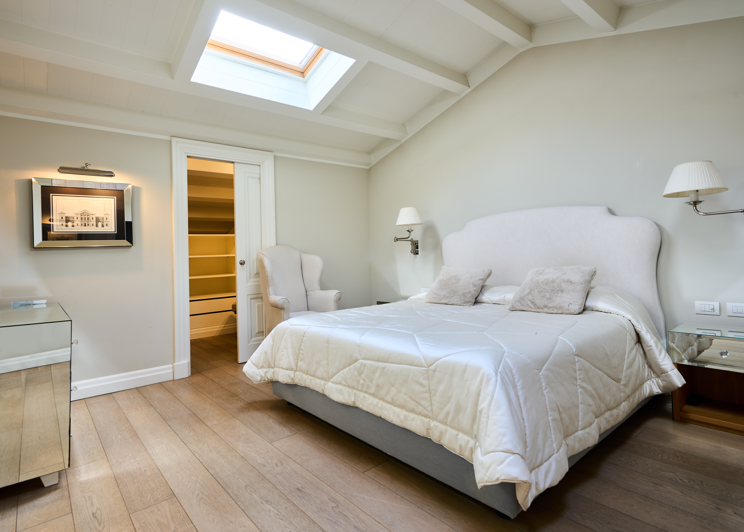Camera padronale con bagno en suite dotato di vasca e due ampie stanze guardaroba. La stanza è impreziosita da due ampi lucernari elettrificati, vera unicità dell’immobile, che donano una straordinaria luminosità naturale durante tutto l’arco della giornata. La luce zenitale crea un’atmosfera ariosa e suggestiva, esaltando le finiture e rendendo l’ambiente intimo ma al tempo stesso scenografico.