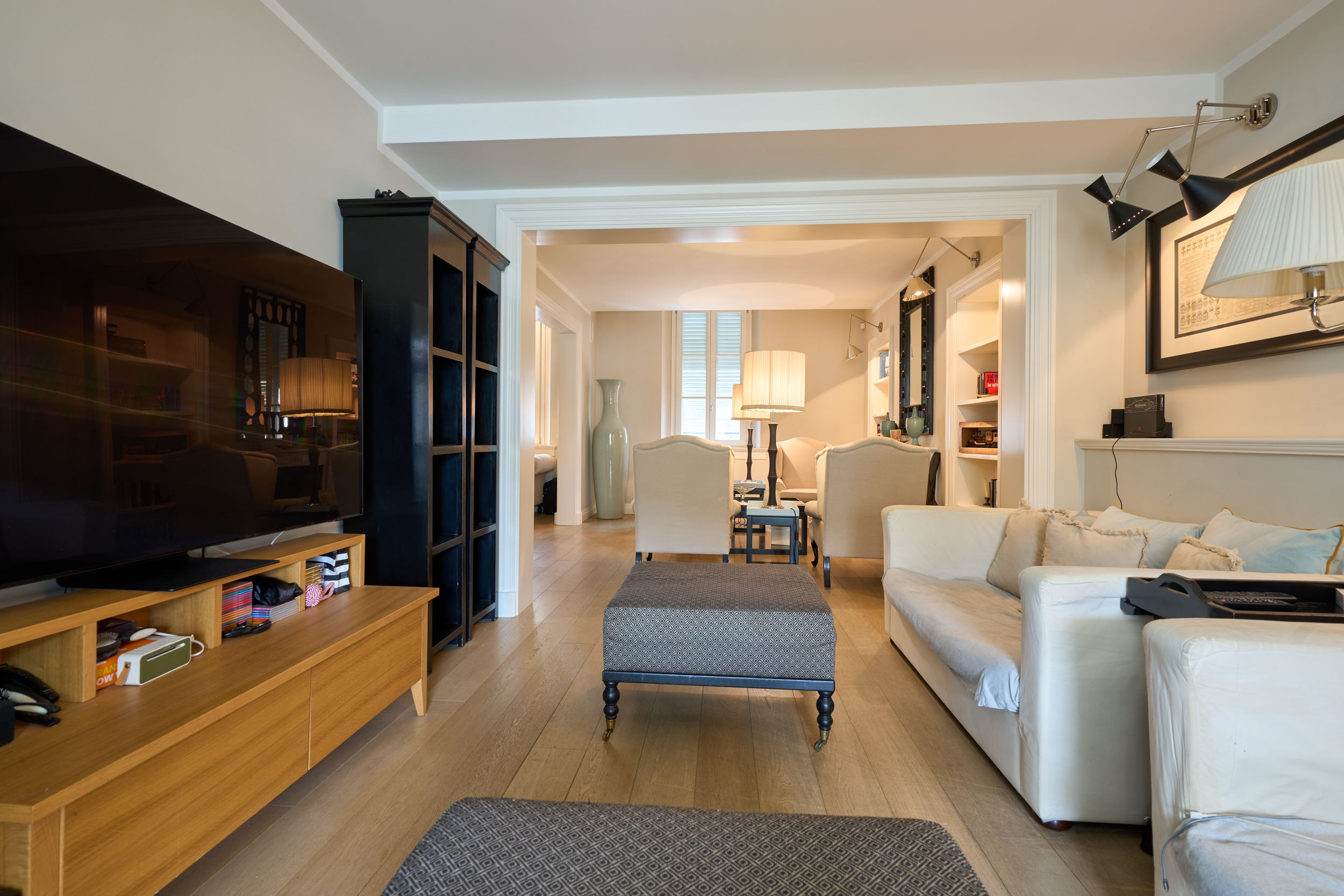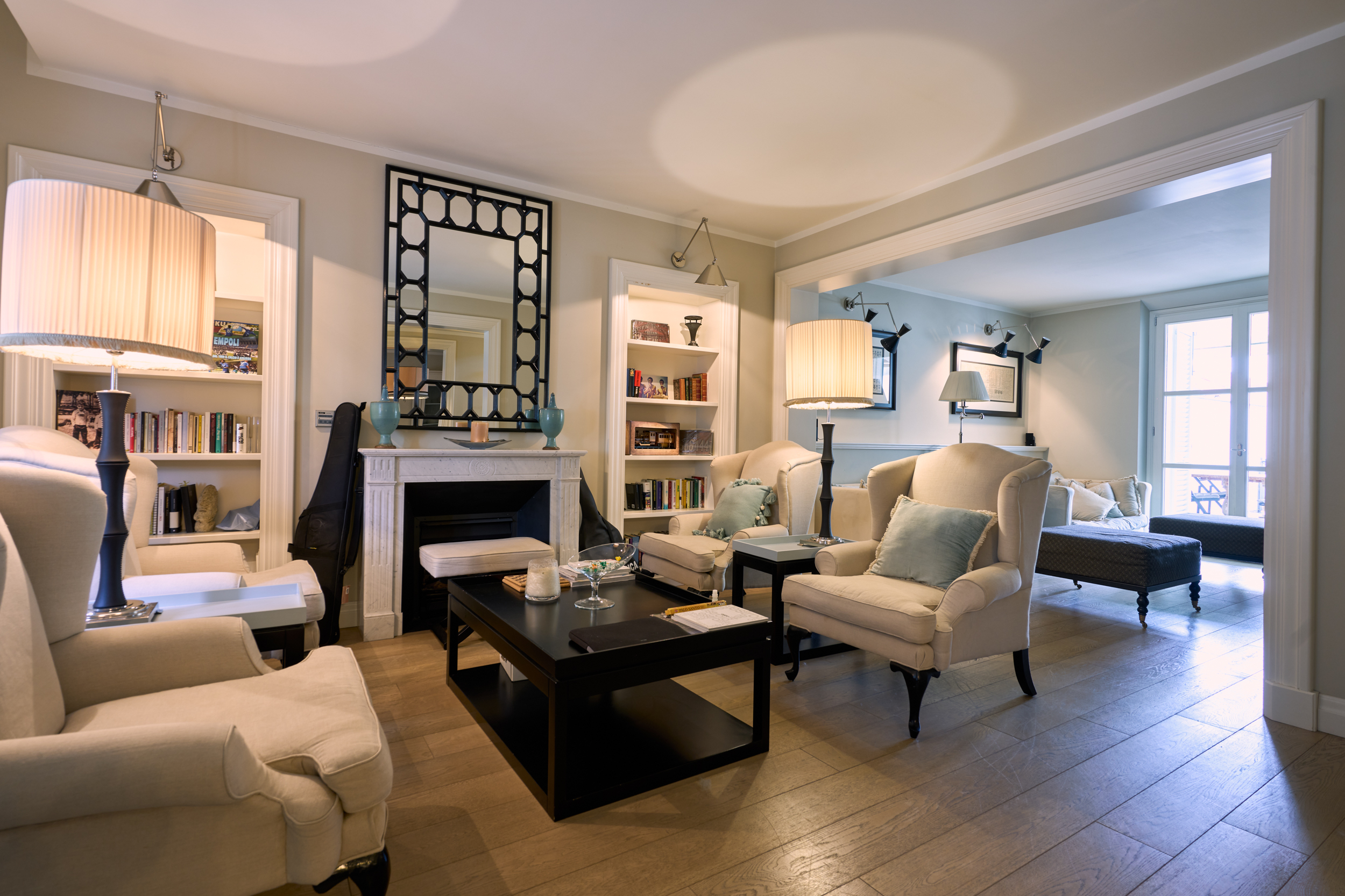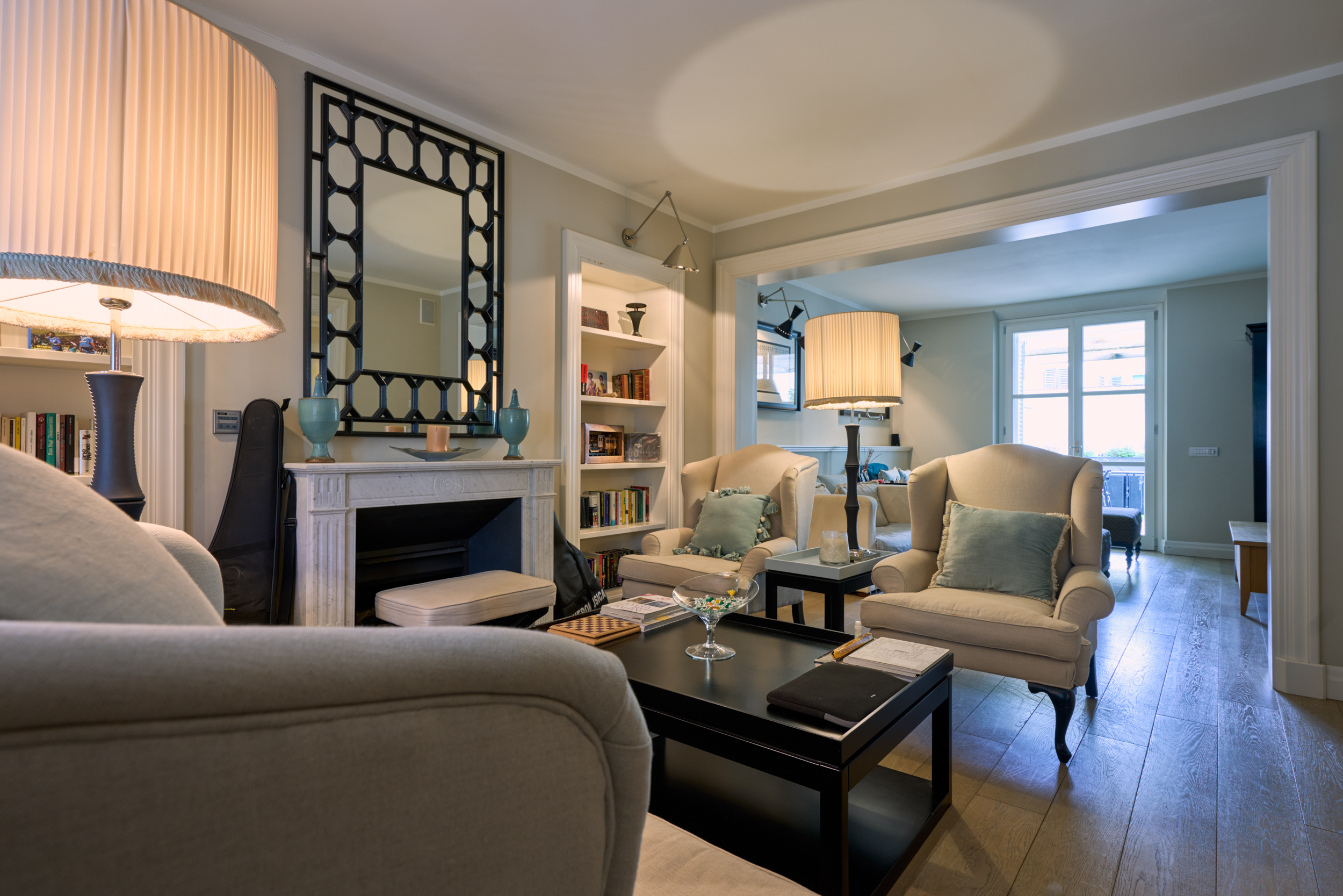 Il salotto, elegante e accogliente, è impreziosito dal camino che ne diventa elemento centrale, creando un’atmosfera calda e raffinata. Gli ambienti sono luminosi e ben proporzionati, valorizzati dal parquet e dalle ampie aperture.