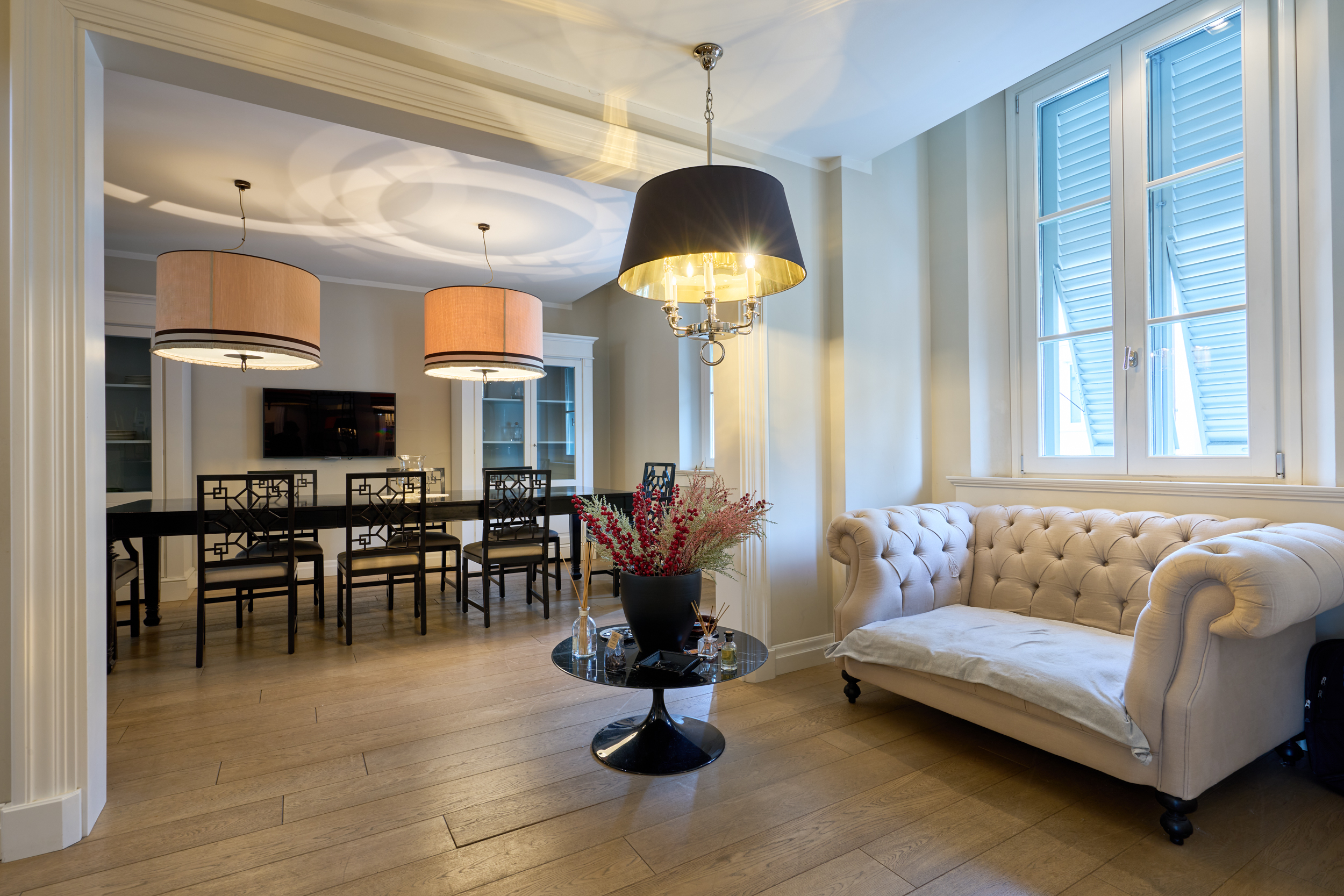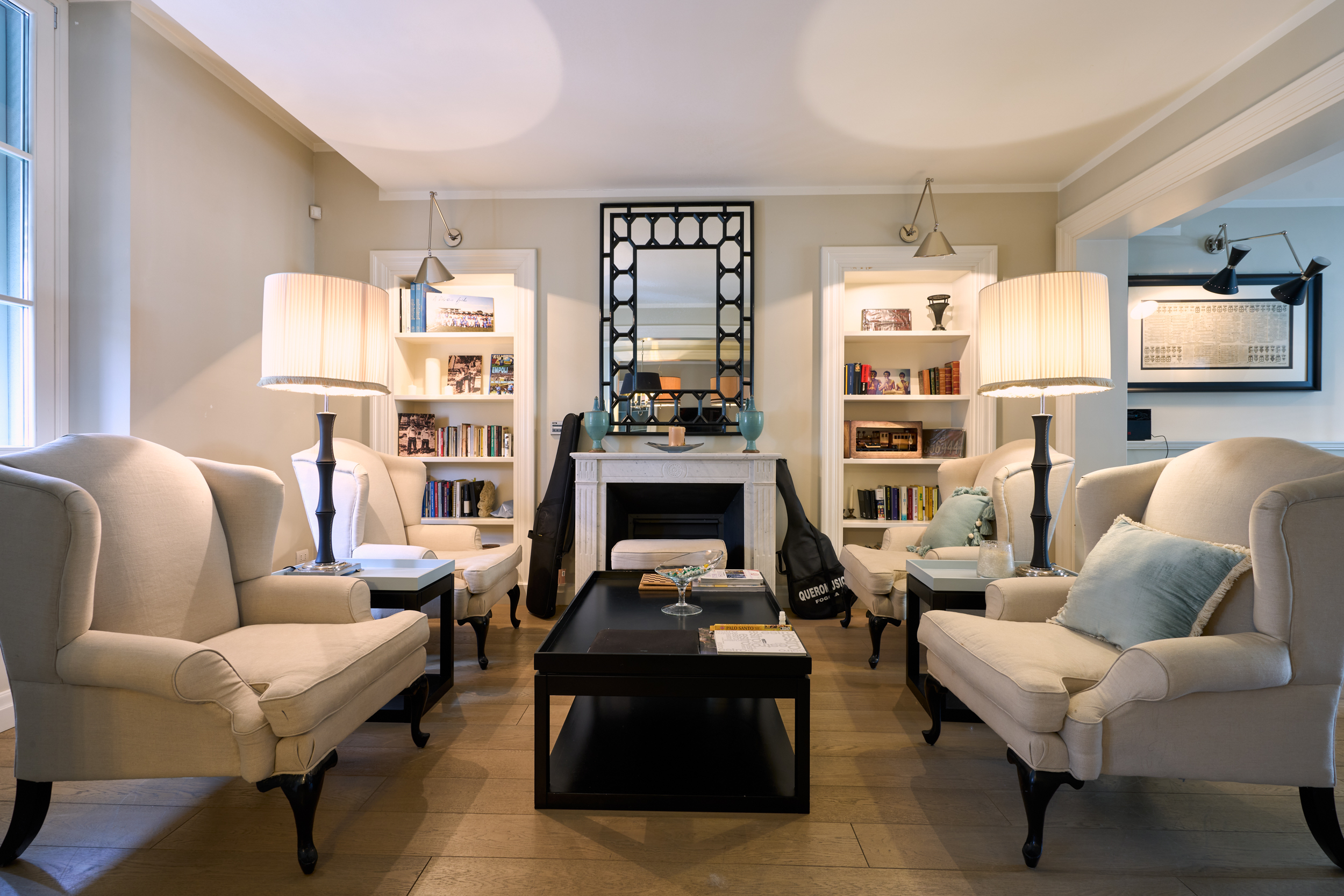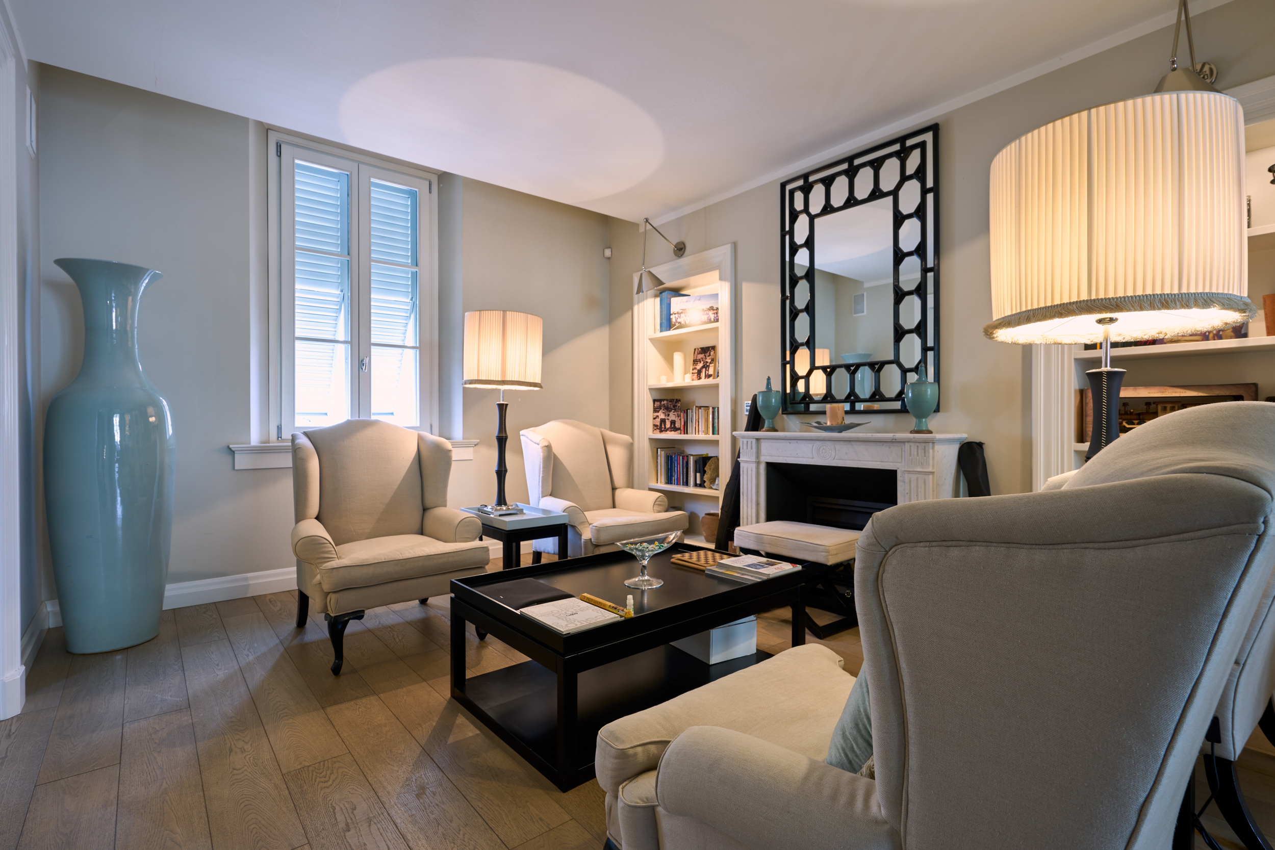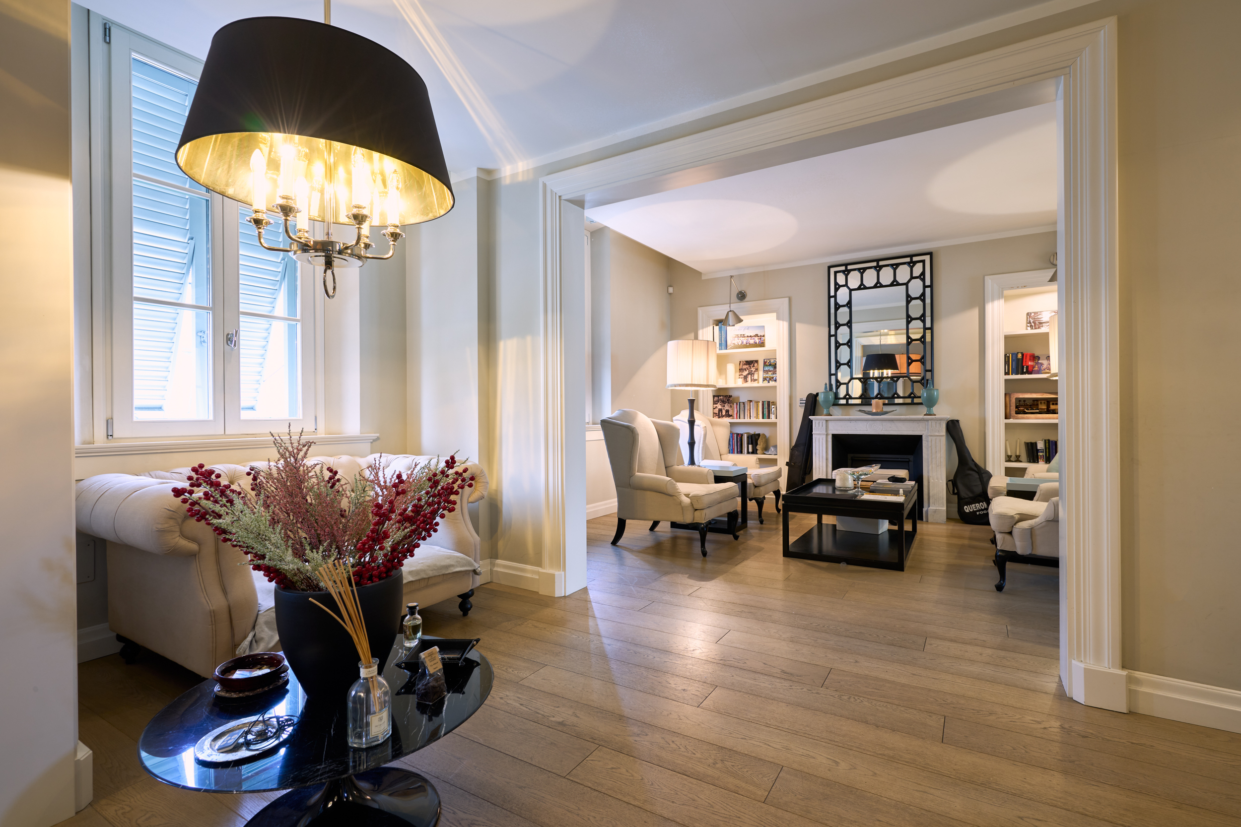 Il salotto, elegante e accogliente, è impreziosito dal camino che ne diventa elemento centrale, creando un’atmosfera calda e raffinata. Gli ambienti sono luminosi e ben proporzionati, valorizzati dal parquet e dalle ampie aperture.