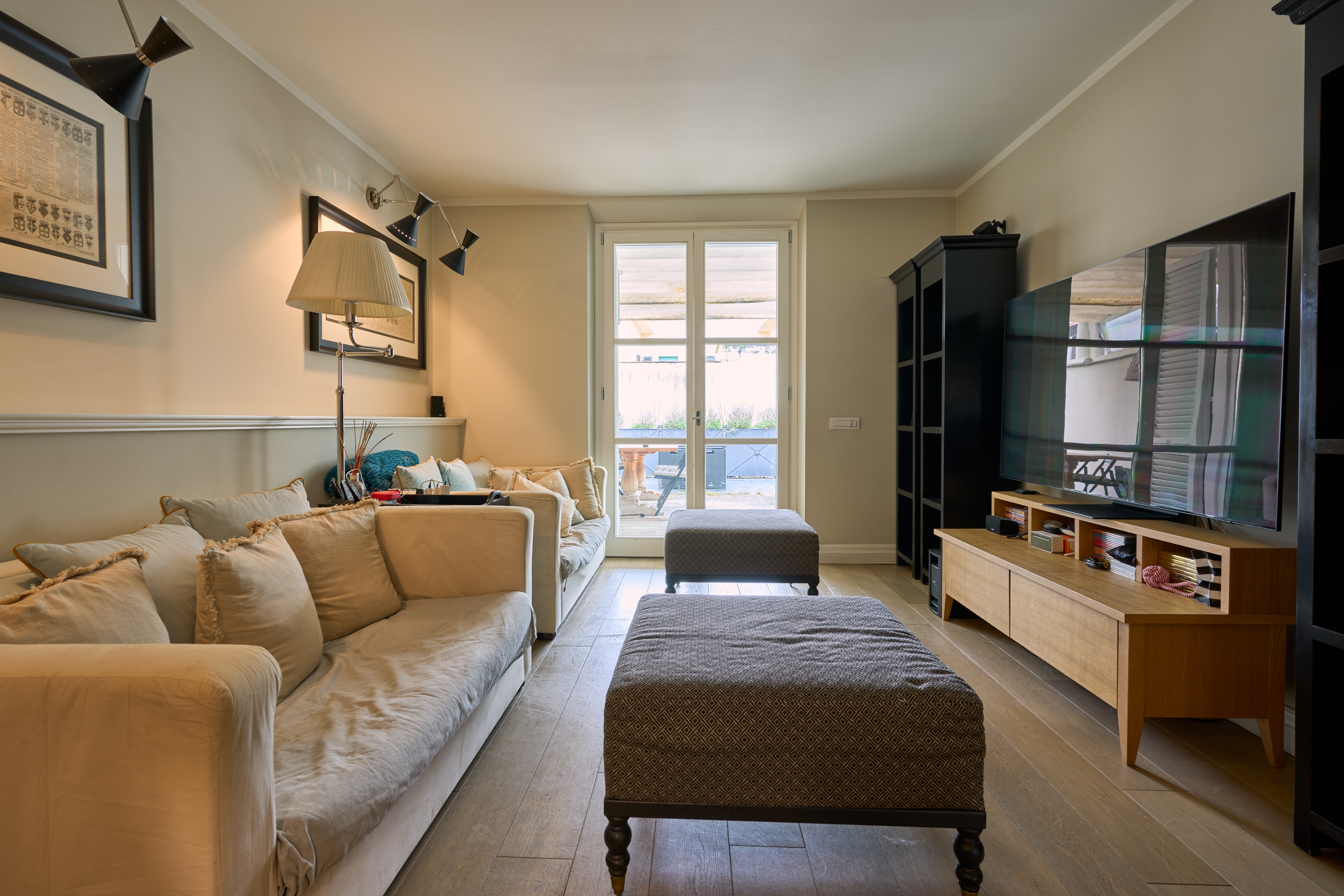 Il soggiorno, in continuità con la sala da pranzo, si apre direttamente sulla splendida terrazza abitabile attraverso grandi vetrate, offrendo una perfetta fusione tra interno ed esterno.