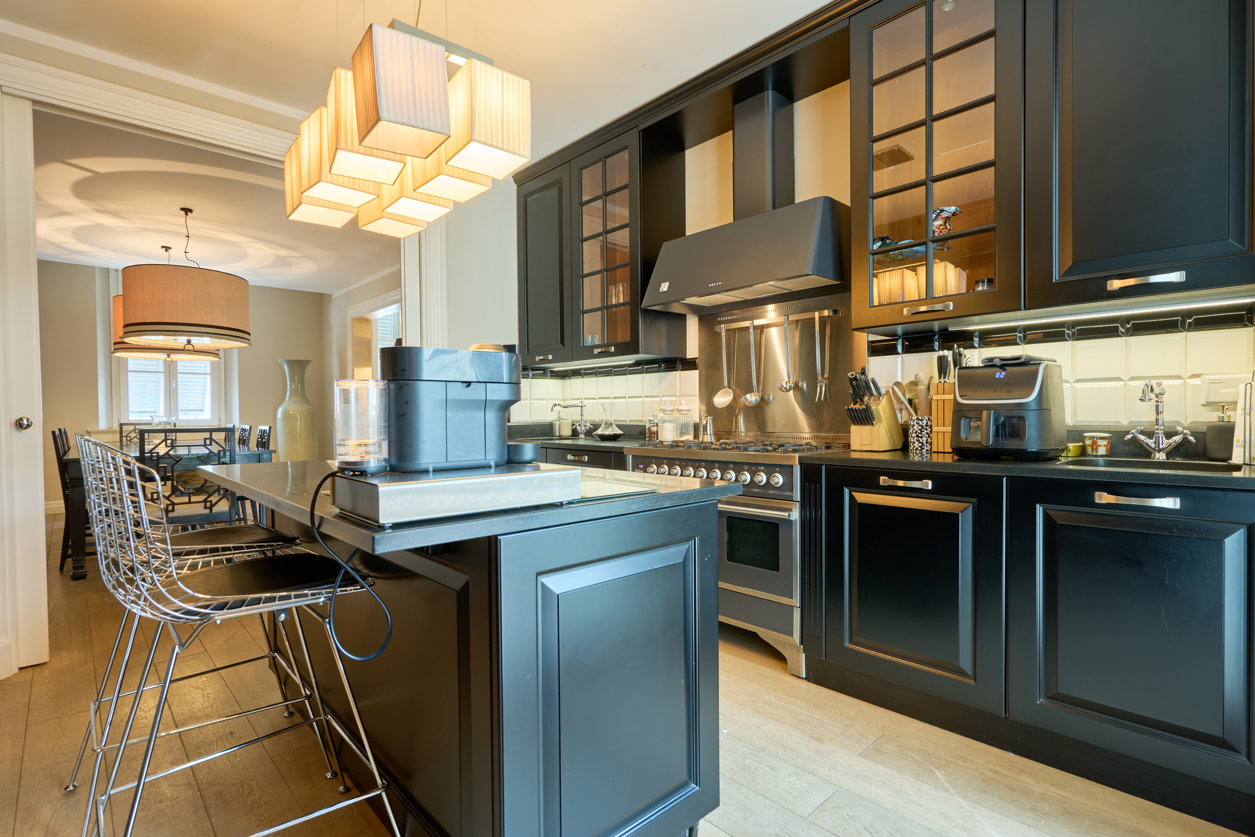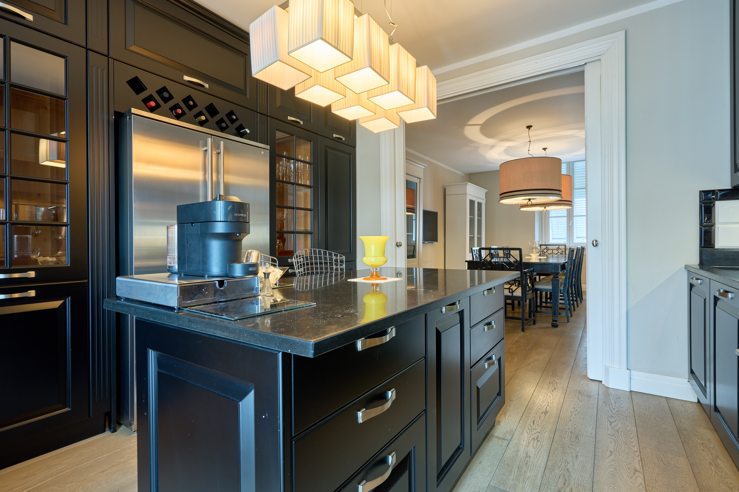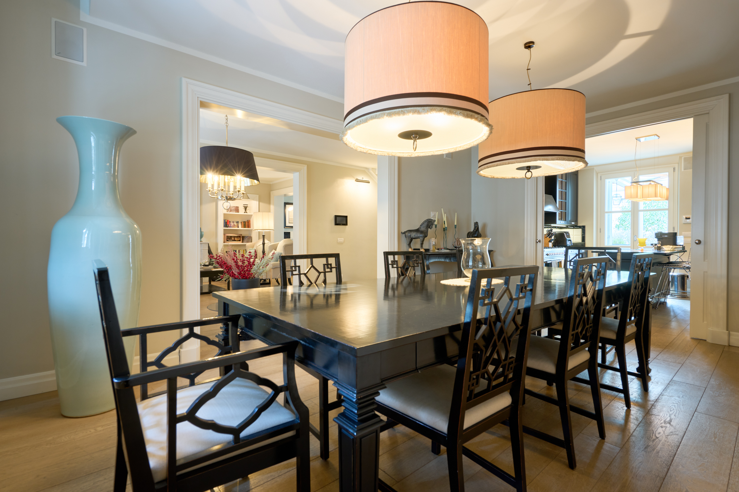 Grande sala da pranzo con cucina a vista, separabile all’occorrenza tramite un’elegante e scenografica porta scorrevole