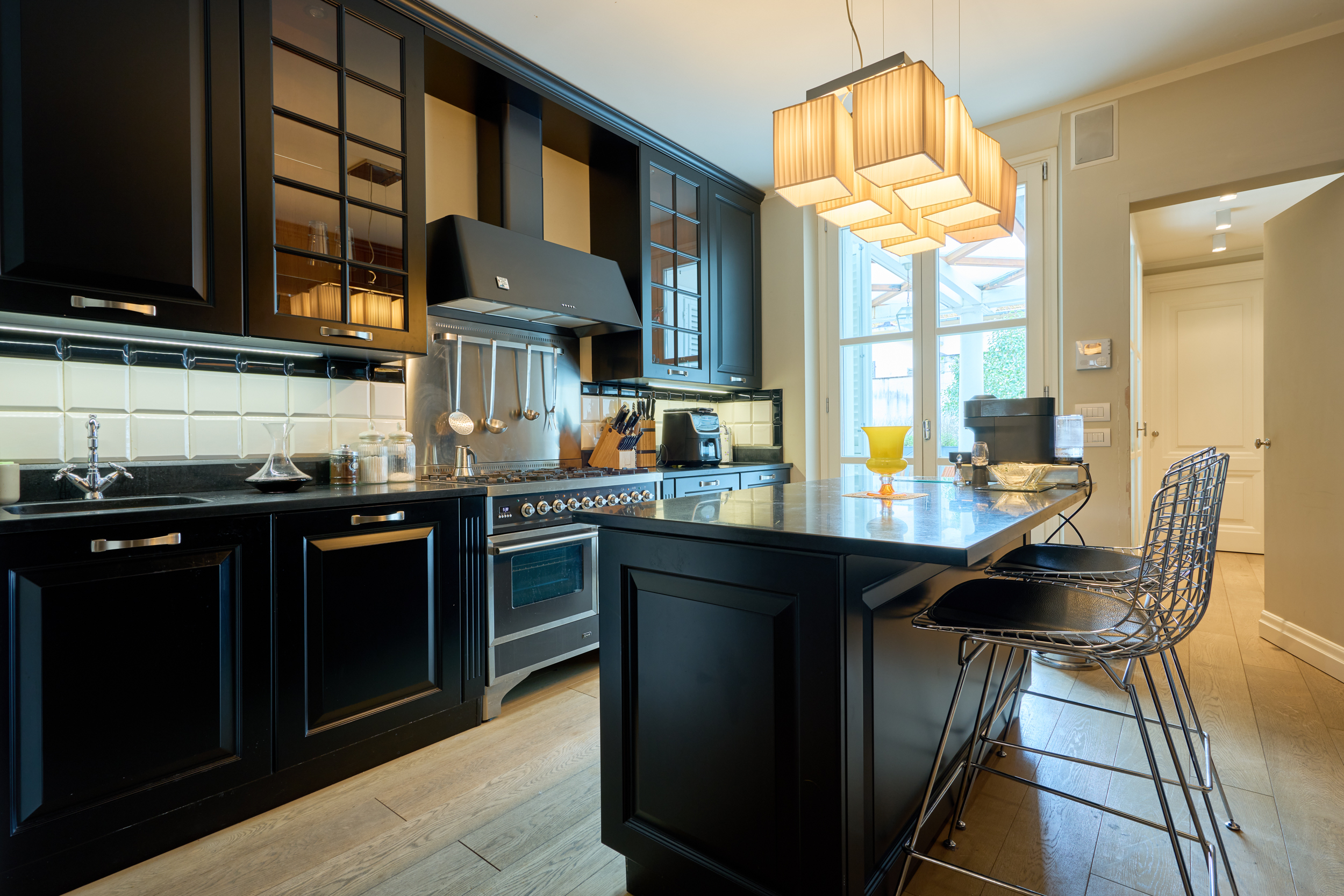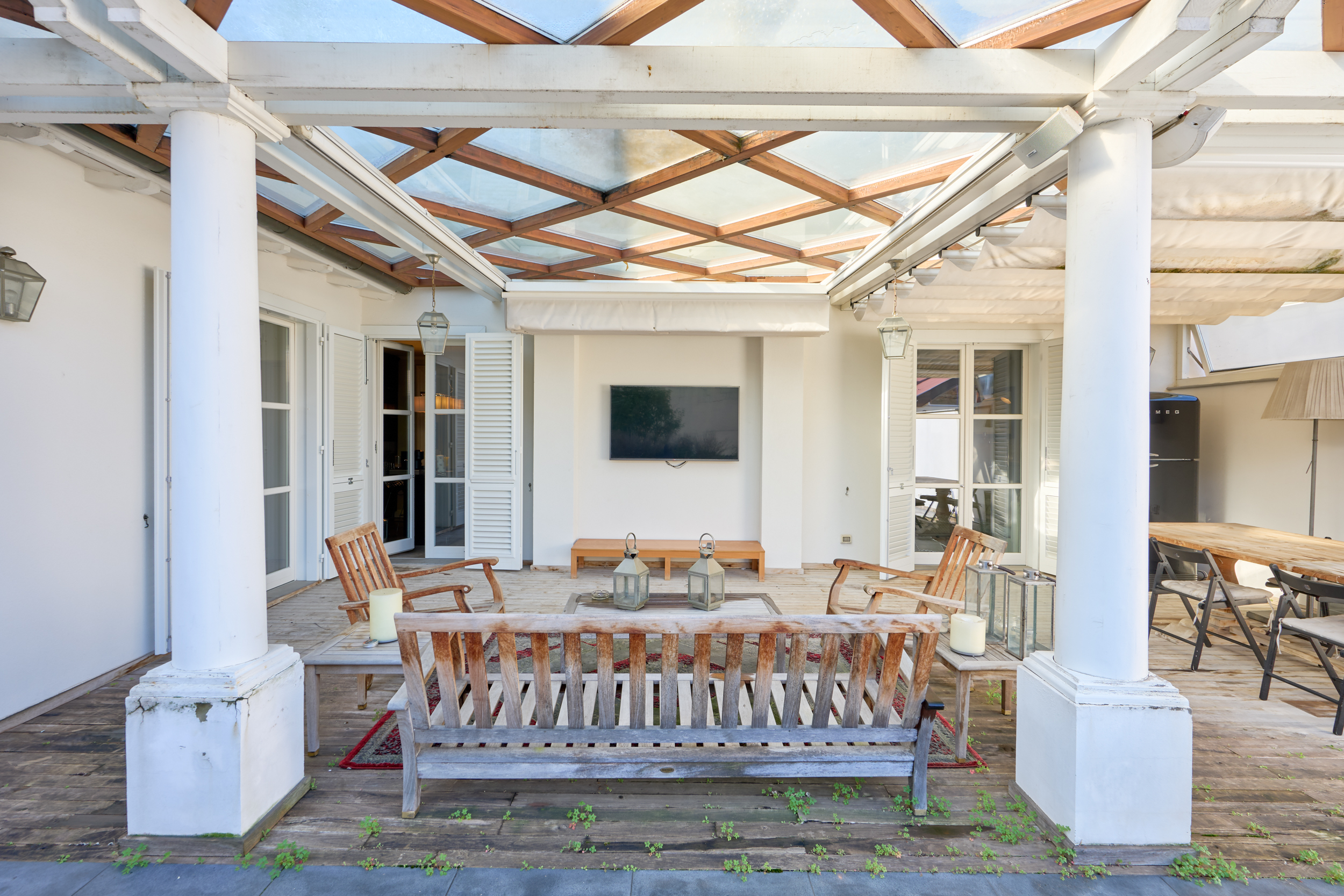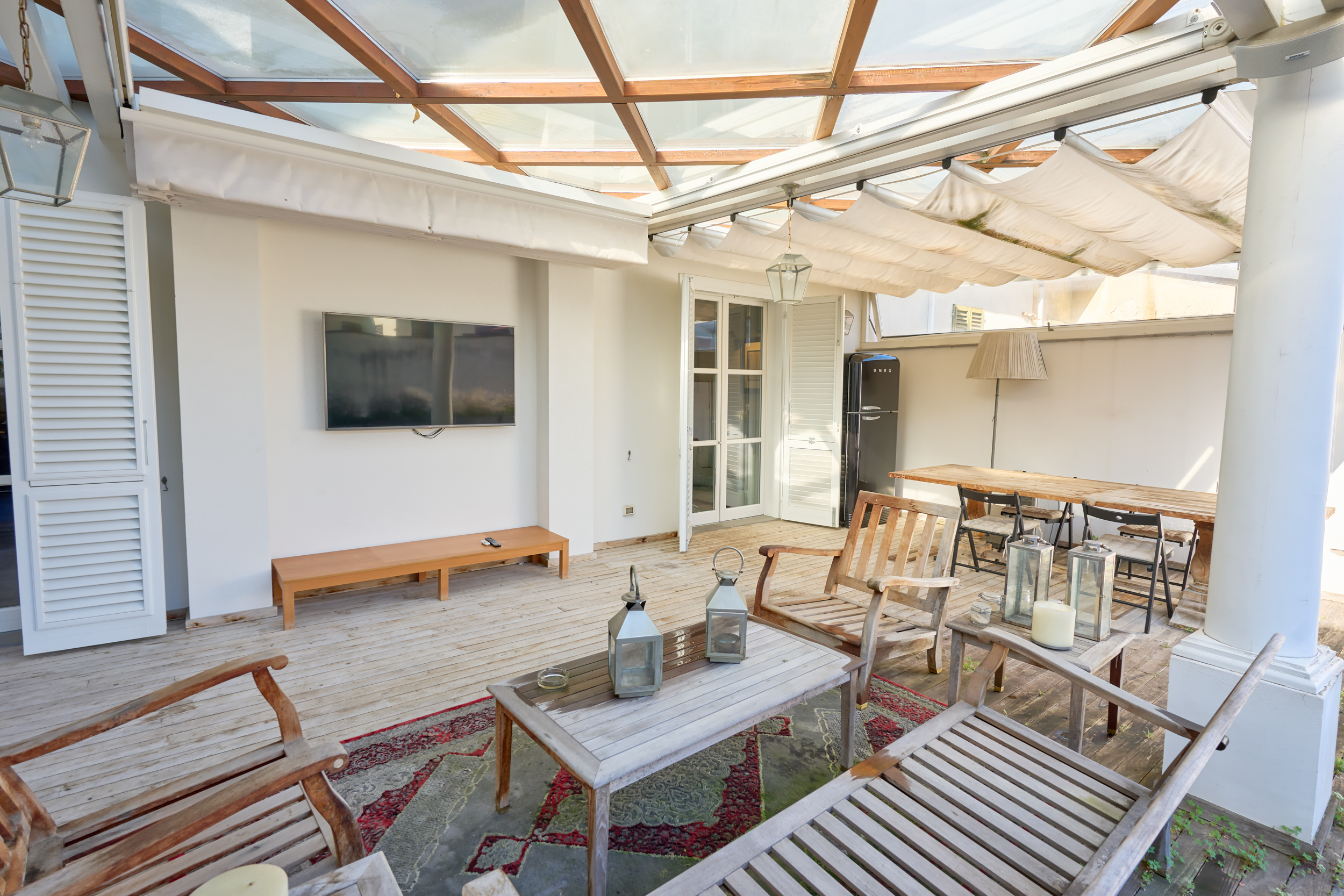 Dalla cucina si accede direttamente alla magnifica terrazza abitabile, autentico valore aggiunto della proprietà: uno spazio esclusivo nel cuore della città, completo di cucina esterna. La terrazza, in parte coperta da un moderno sistema elettrificato di tendaggi e in parte scoperta, salotto outdoor e grande tavolo per pranzi e cene all’aperto. Una vera rarità per bellezza, comfort e praticità.