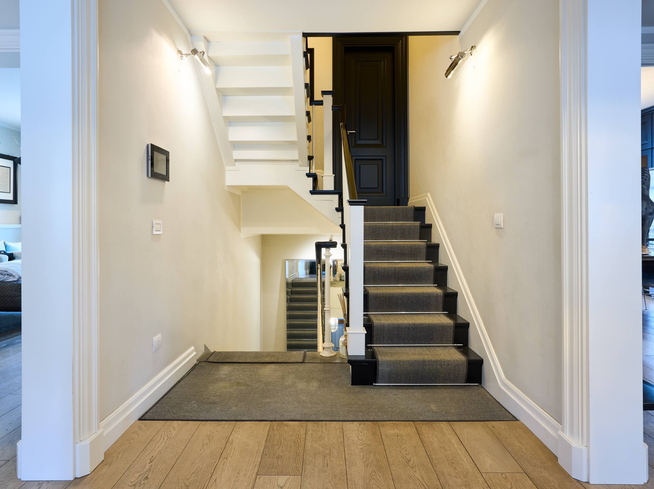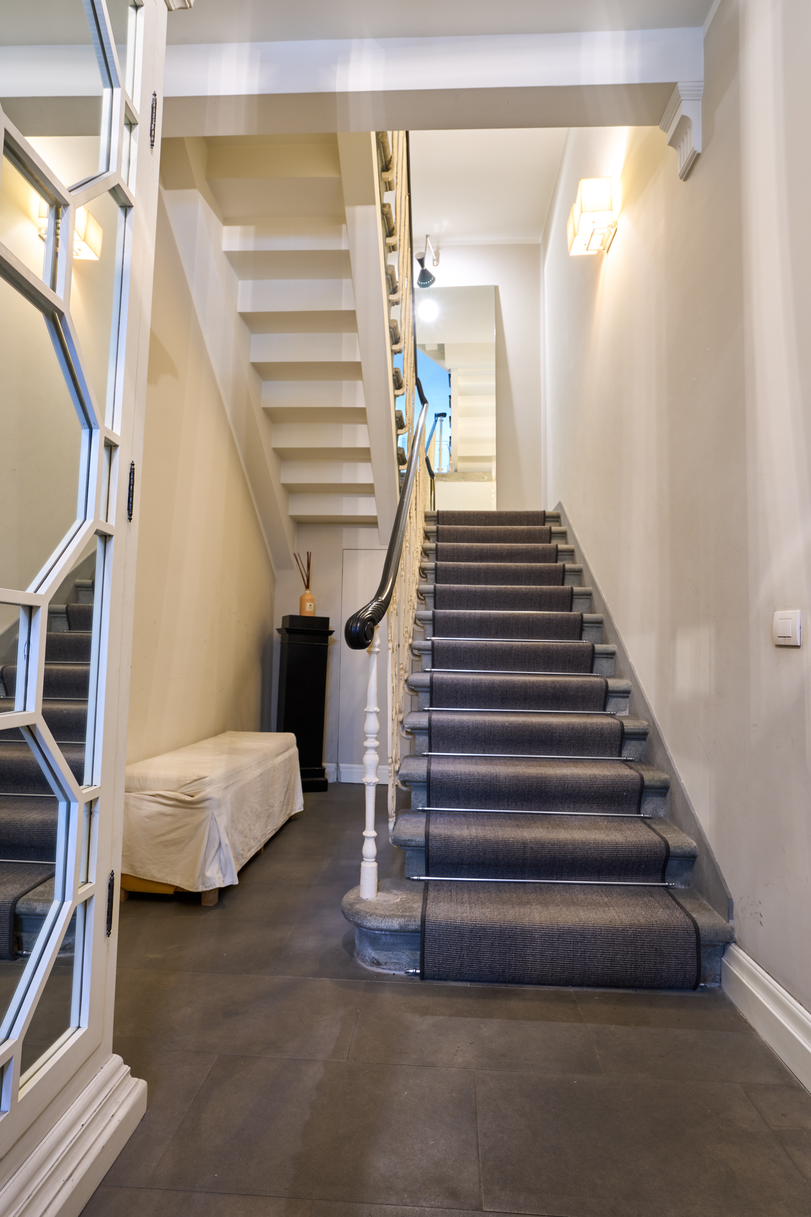 L’ingresso indipendente introduce in un ampio e raffinato disimpegno, impreziosito da una scala di design che conduce al piano primo, dove si sviluppa l’intera zona giorno insieme allo straordinario spazio outdoor.