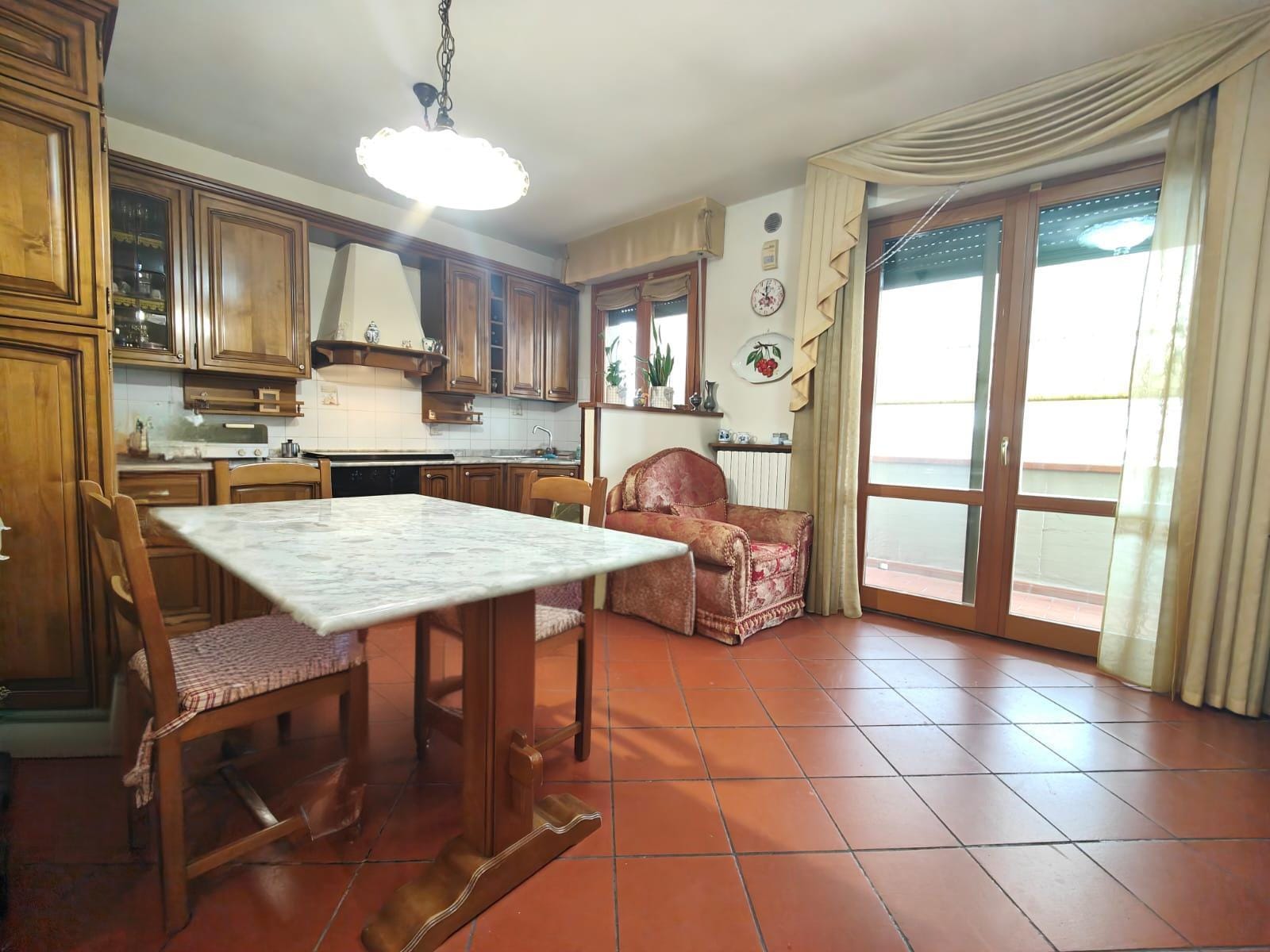 L’ingresso indipendente conduce a un giardino privato, curato e accogliente. Attraverso tre scalini si accede direttamente al soggiorno ampio e luminoso, collegato in modo armonioso alla grande cucina abitabile, anch’essa molto luminosa e con accesso diretto alla terrazza.