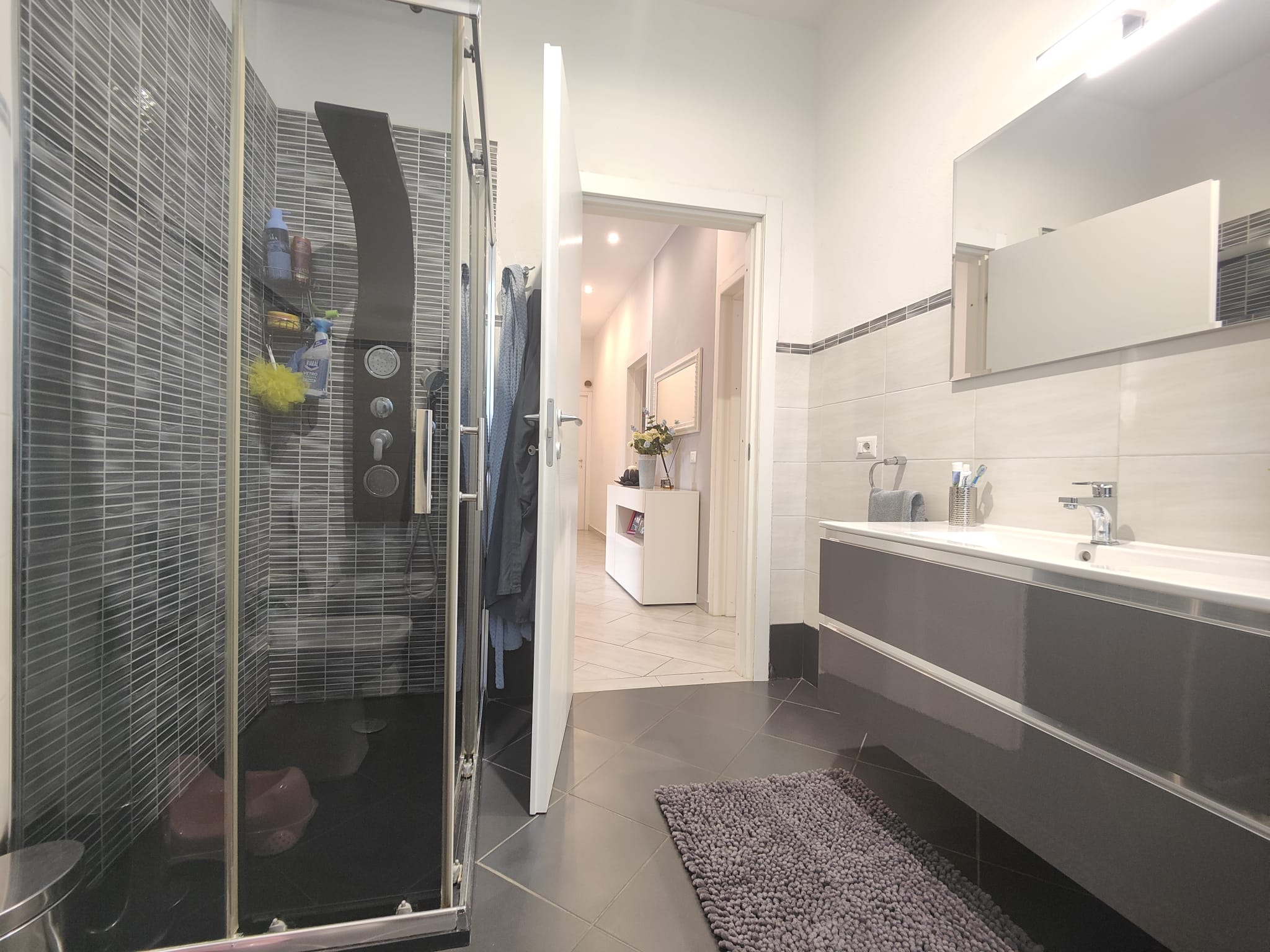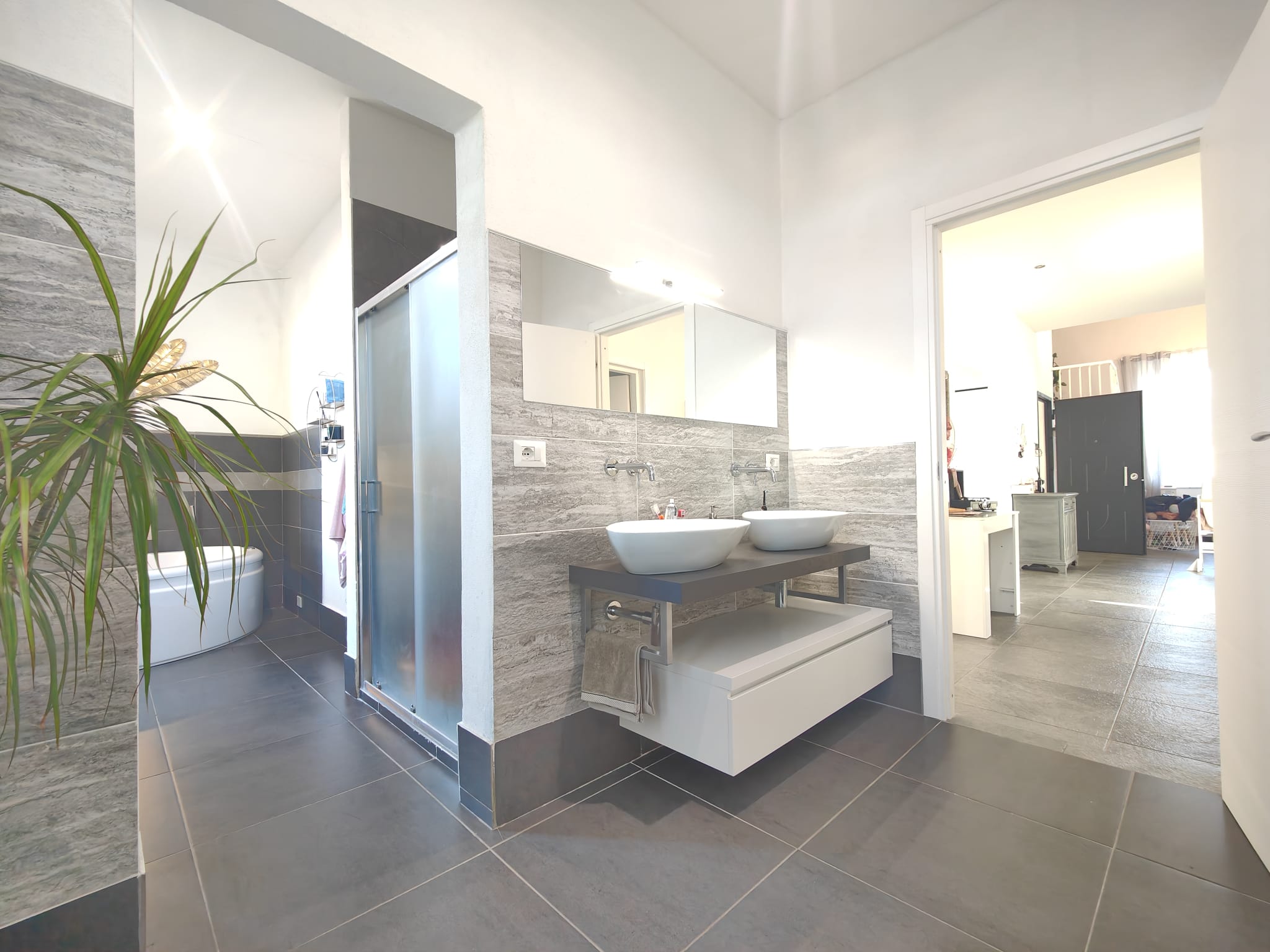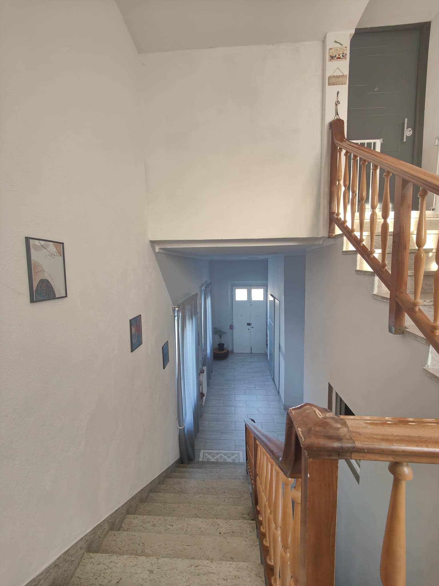L’accesso alla proprietà avviene tramite un cancello centrale, che conduce all’elegante area d’ingresso comune: da qui, pochi scalini portano ai portoni indipendenti dei due appartamenti, garantendo autonomia e privacy totale.
