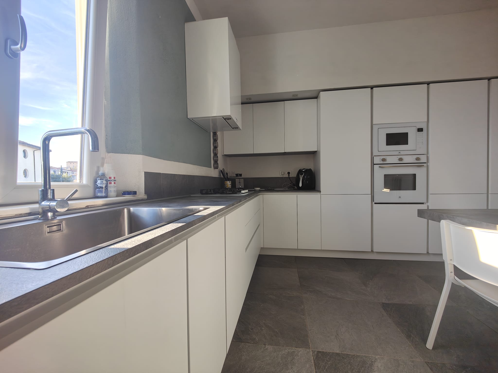 Dal soggiorno si accede al grande balcone panoramico, servito da una doppia scala che conduce direttamente al giardino privato, perfetto per momenti di relax all’aperto.