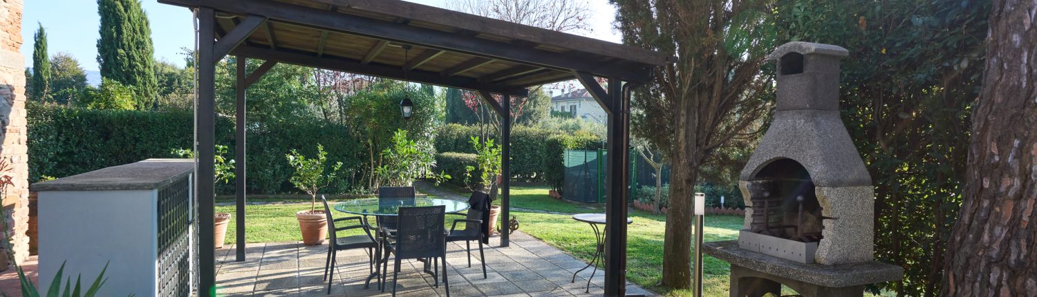 dal soggiorno si accede allo spazio esterno coperto, in giardino, perfetto per cene estive e momenti di convivialità all’aperto;
