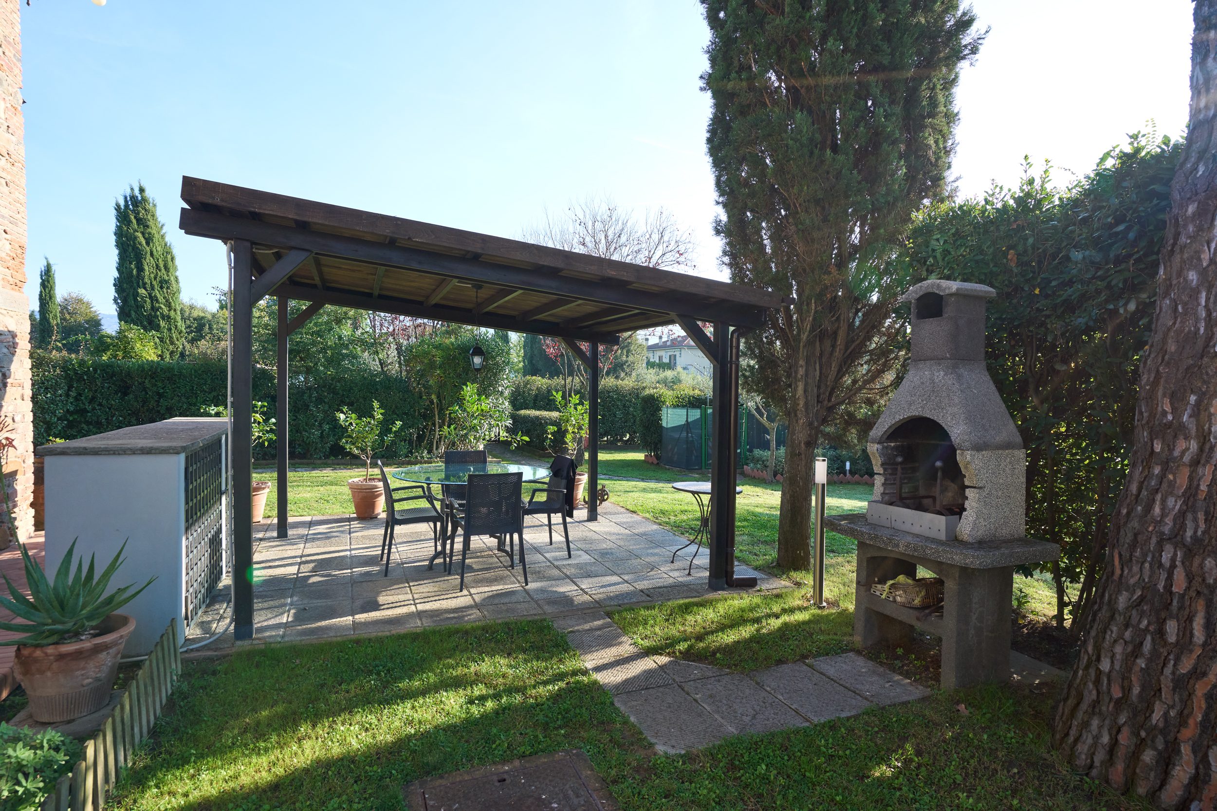 Circondato da un ampio giardino privato attrezzato, l’immobile vanta un accesso comodo e sicuro da due grandi cancelli che si aprono sulla strada principale.