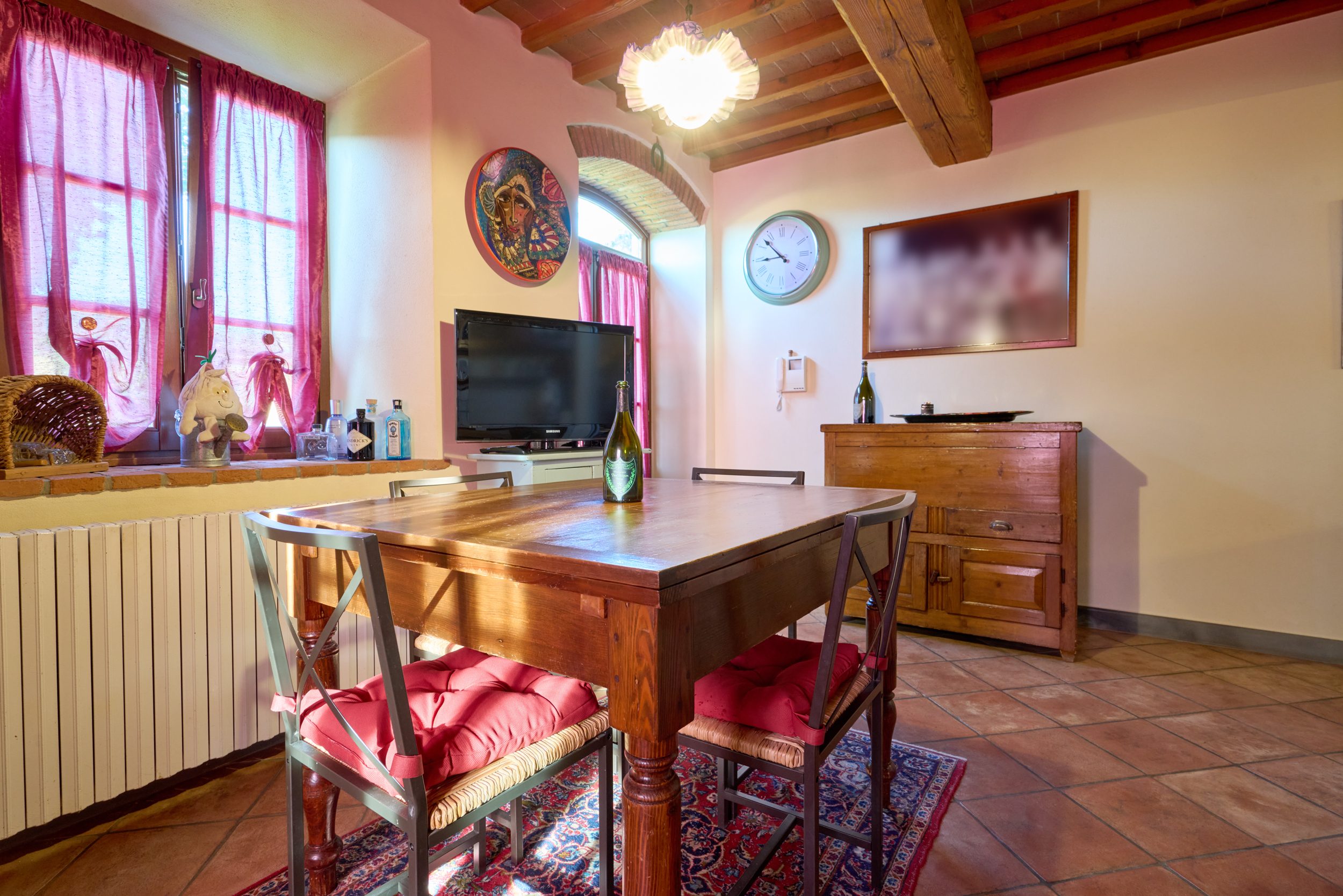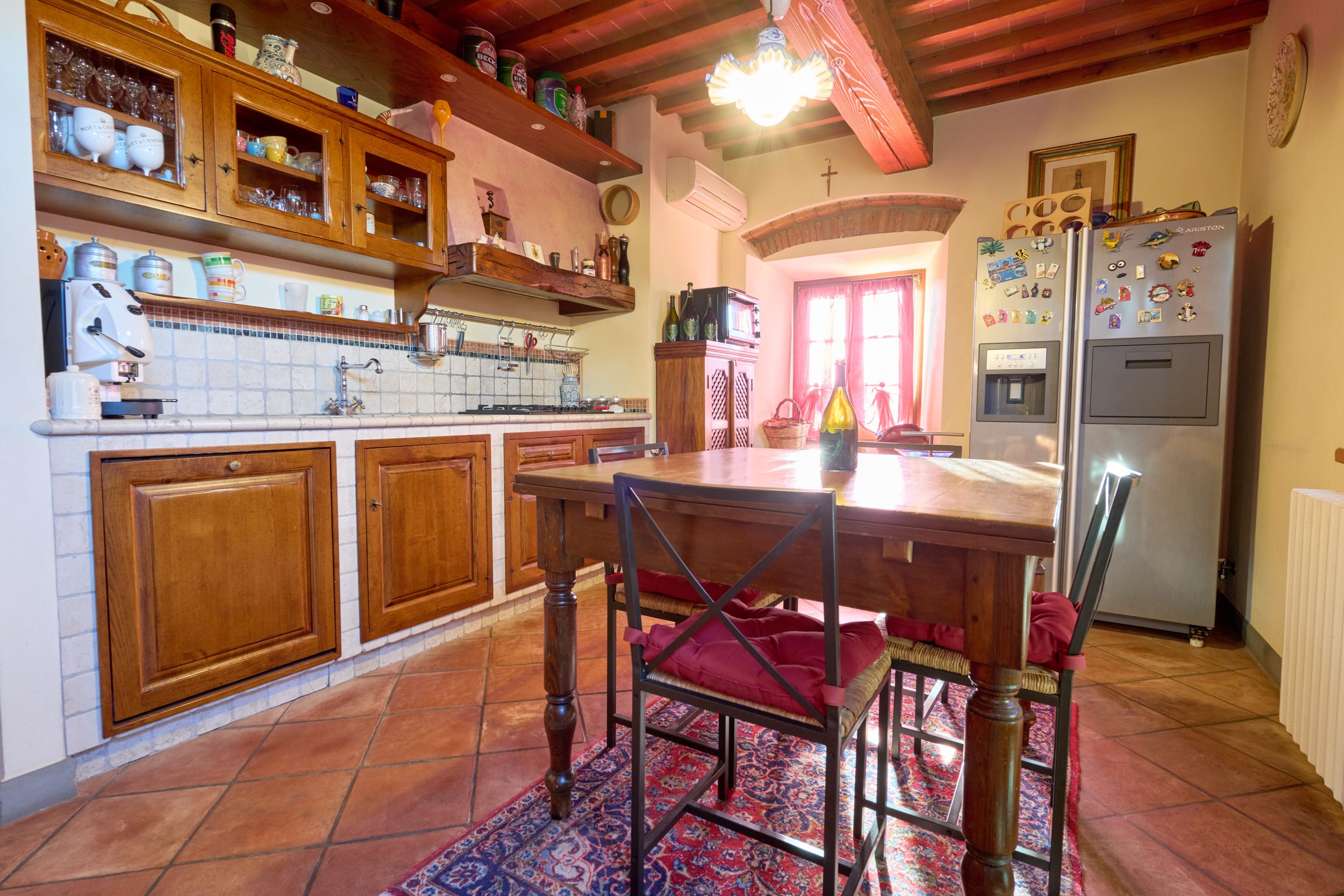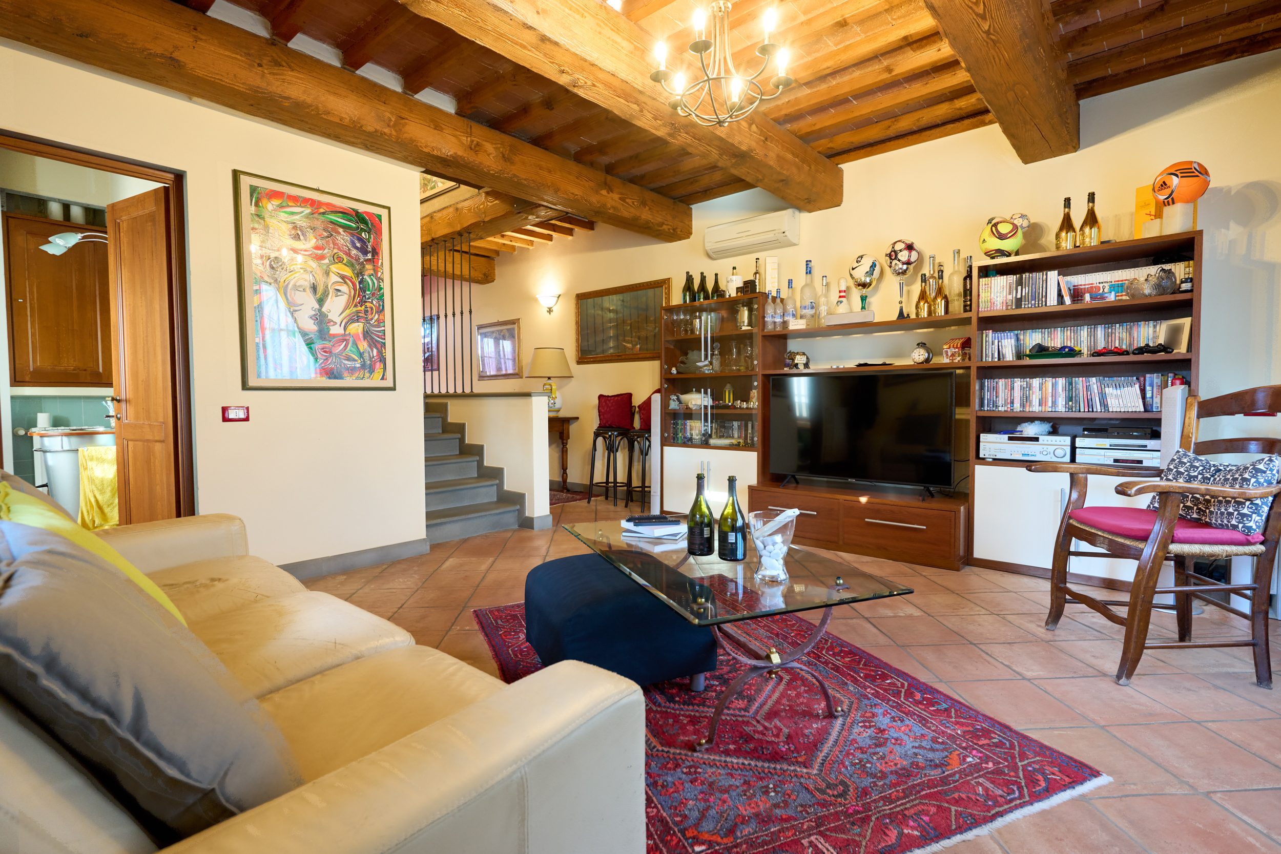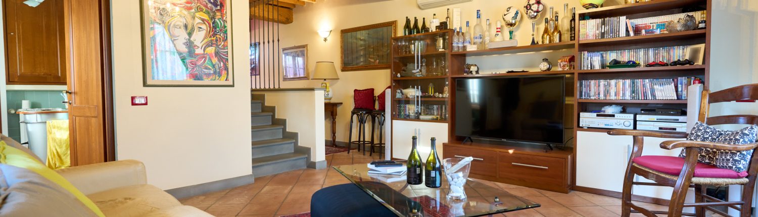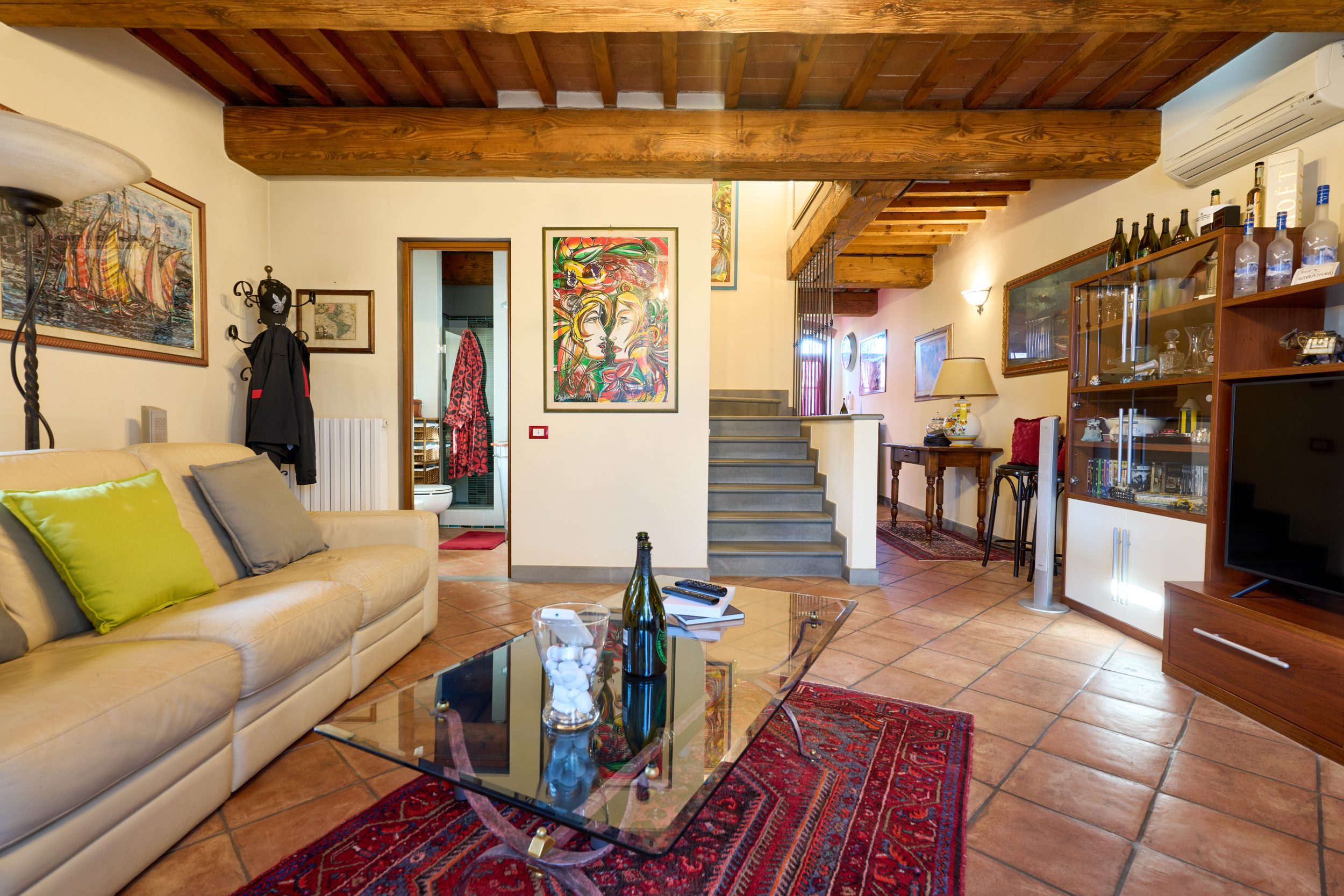 un elegante soggiorno, con soffitti a travi a vista e pavimenti in autentico cotto toscano di pregio. Al centro, un caminetto di alta qualità che impreziosisce l’ambiente e regala un’atmosfera intima e suggestiva;