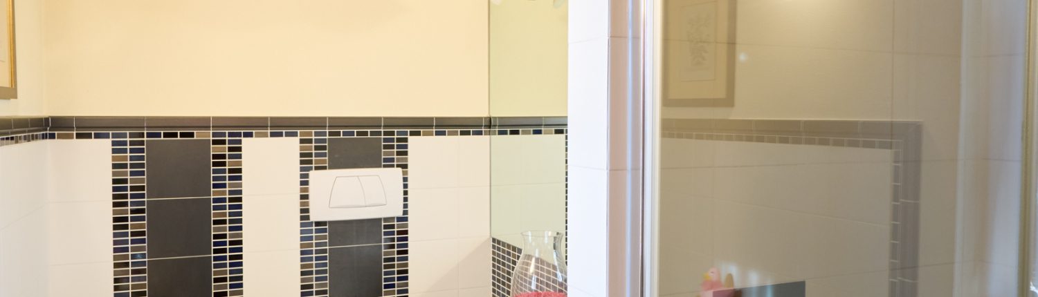 un bagno ospiti, finestrato e rifinito con materiali di lusso.