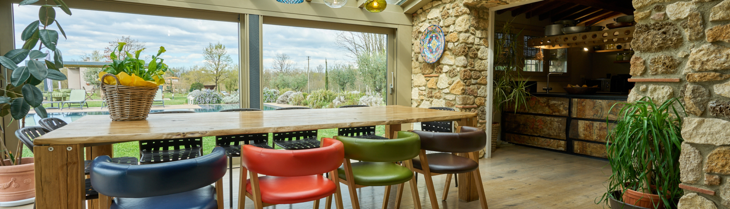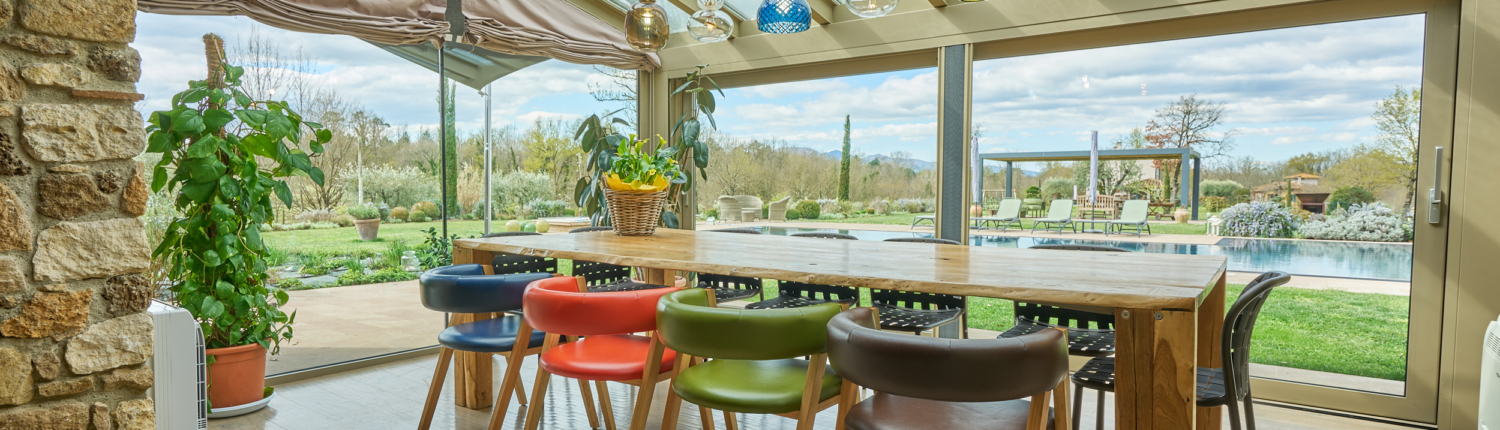 La veranda in vetro, sospesa tra interno ed esterno, regala momenti senza tempo: colazioni lente, tramonti dorati, serate sotto le stelle.
