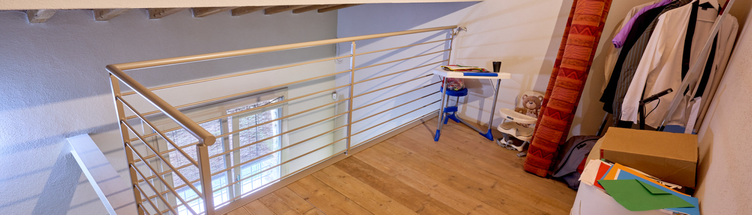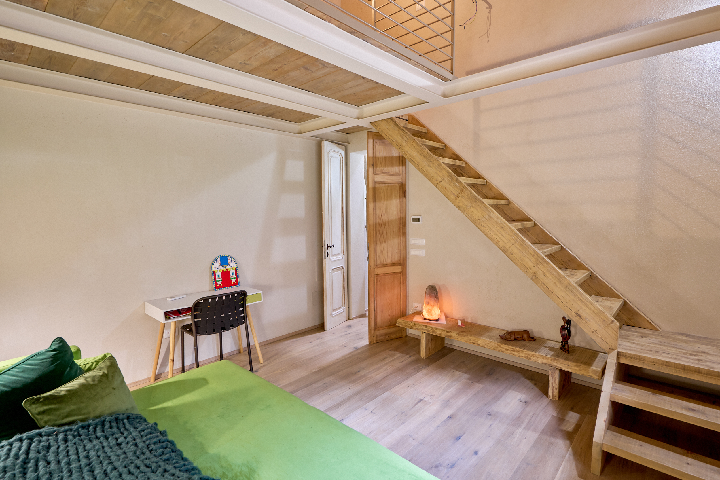 Un soppalco adibito a studio si affaccia sugli spazi sottostanti, creando un dialogo continuo tra architettura e vita quotidiana.