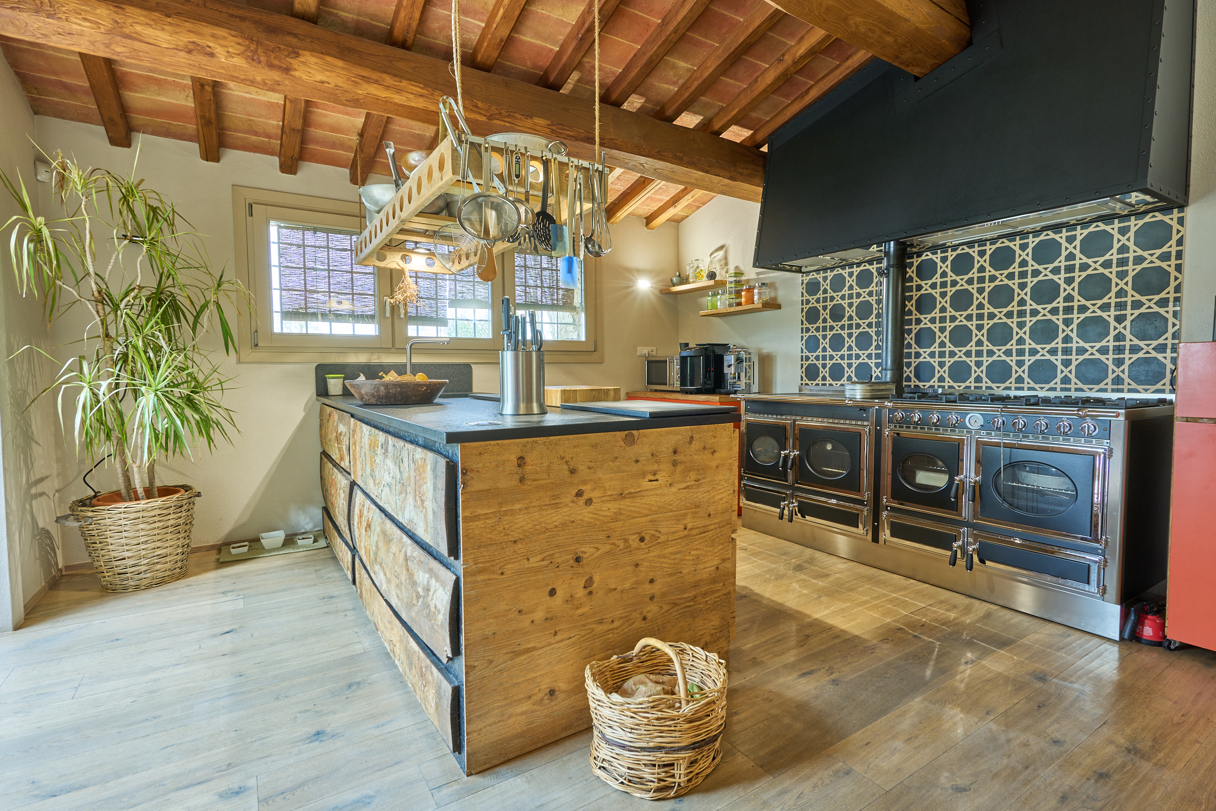 Il soggiorno invita alla convivialità, mentre la cucina su misura, impreziosita da elementi in legno antico del ‘700, diventa il cuore pulsante della casa.