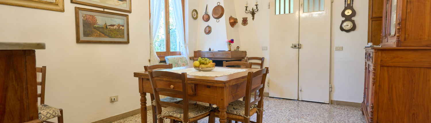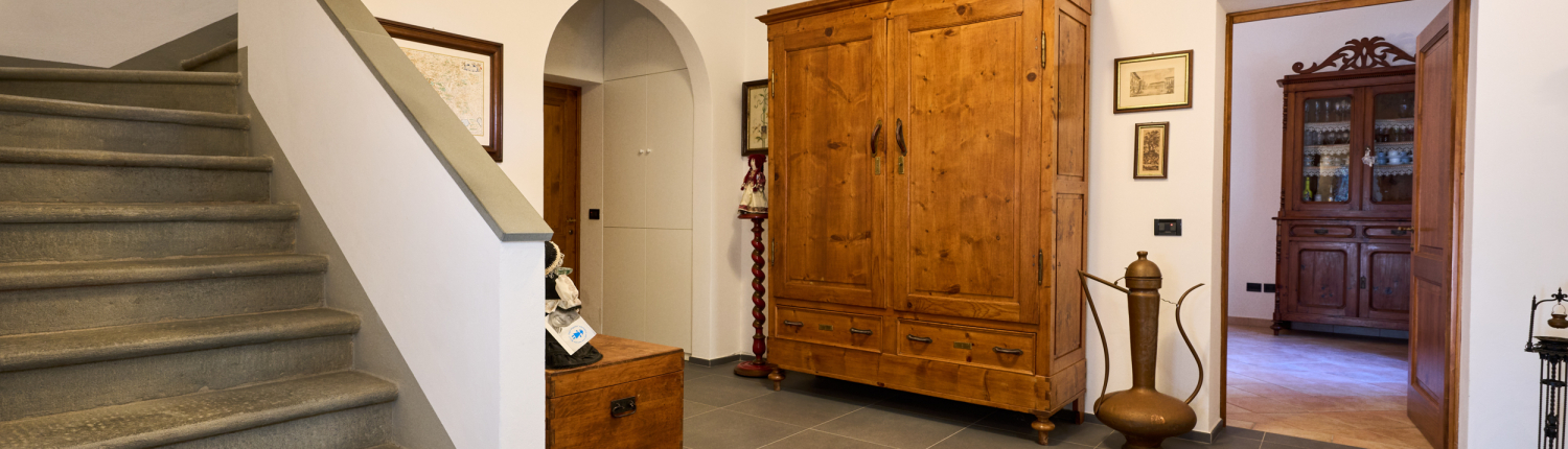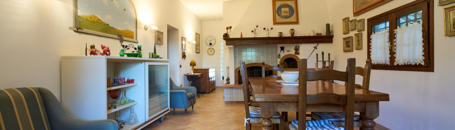 Gli interni, caldi e accoglienti, si distinguono per le finiture tipiche toscane: travi a vista, pavimenti in cotto e pietra naturale. Dal salone principale si accede al giardino privato e al loggiato esterno, perfetto per momenti di relax o degustazioni al tramonto.